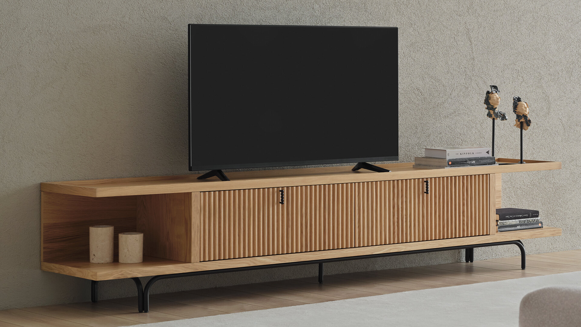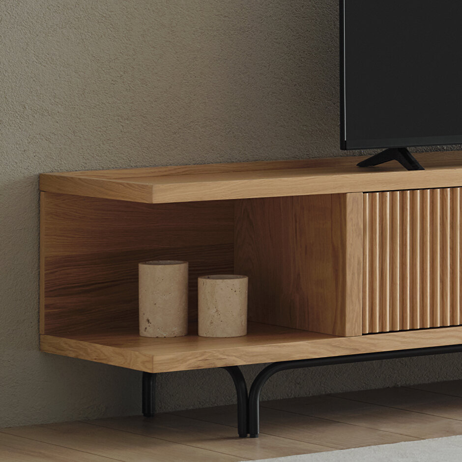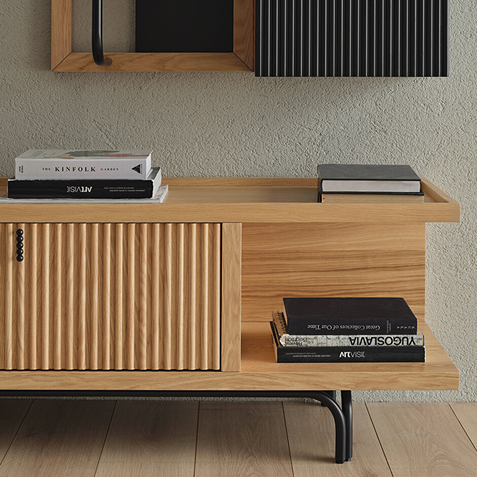 ТВ-стеллаж Austin с детализированной отделкой добавляет стильный акцент в жилые пространства. Обладая лаконичной эстетикой, ТВ-стеллаж Austin привлекает внимание благодаря минималистичному дизайну черных металлических ручек. Обивка из МДФ с дубовой отделкой на поверхности усиливает естественный вид стеллажа.