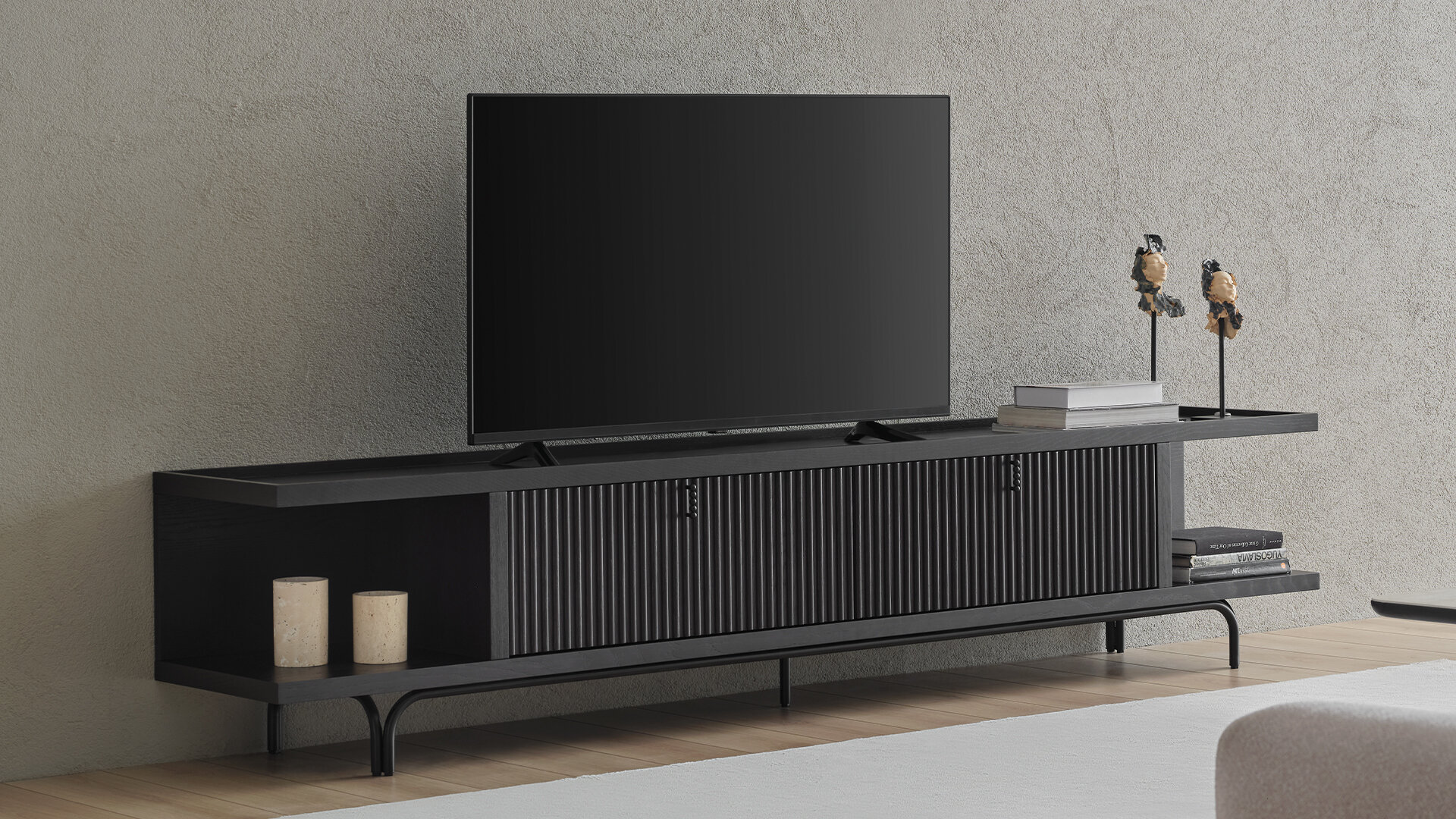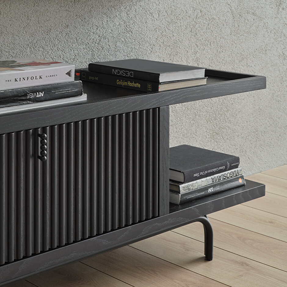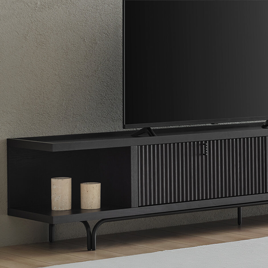 Минималистичное прикосновение ТВ-стеллаж Austin привлекает внимание элегантными деталями. Черные металлические ручки и ножки придают модели минималистичный характер, гармонично подчеркивая ее лаконичную эстетику.