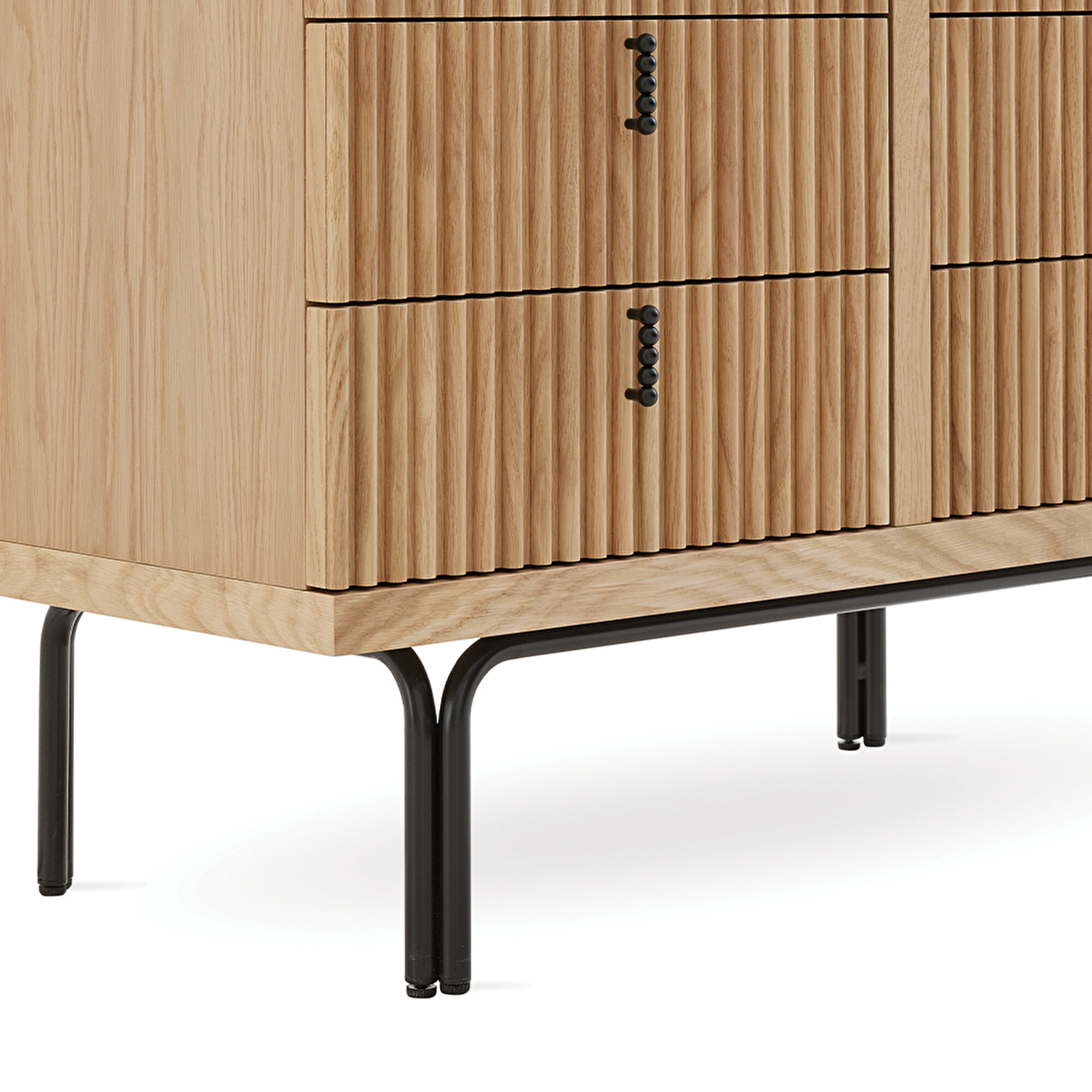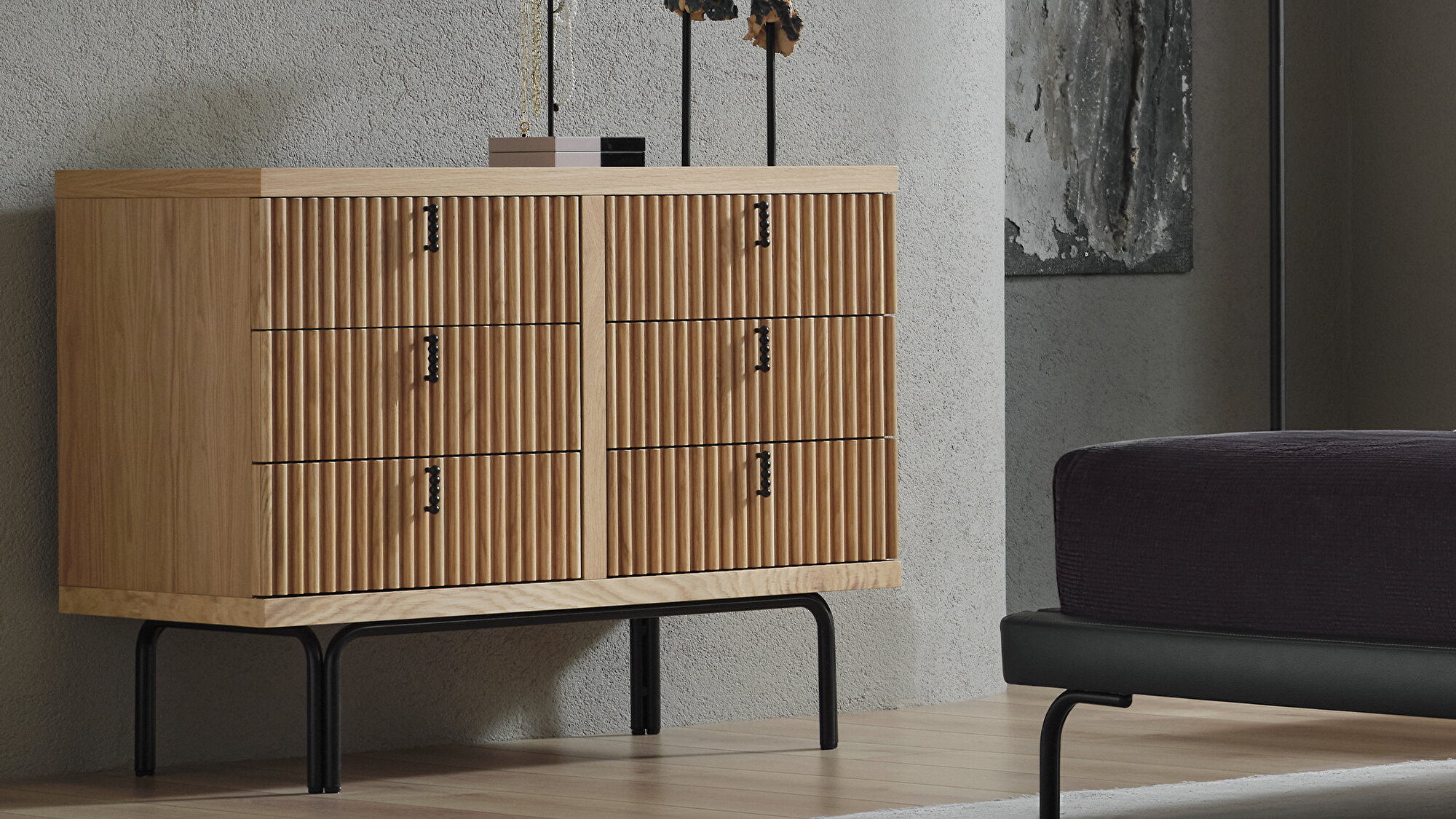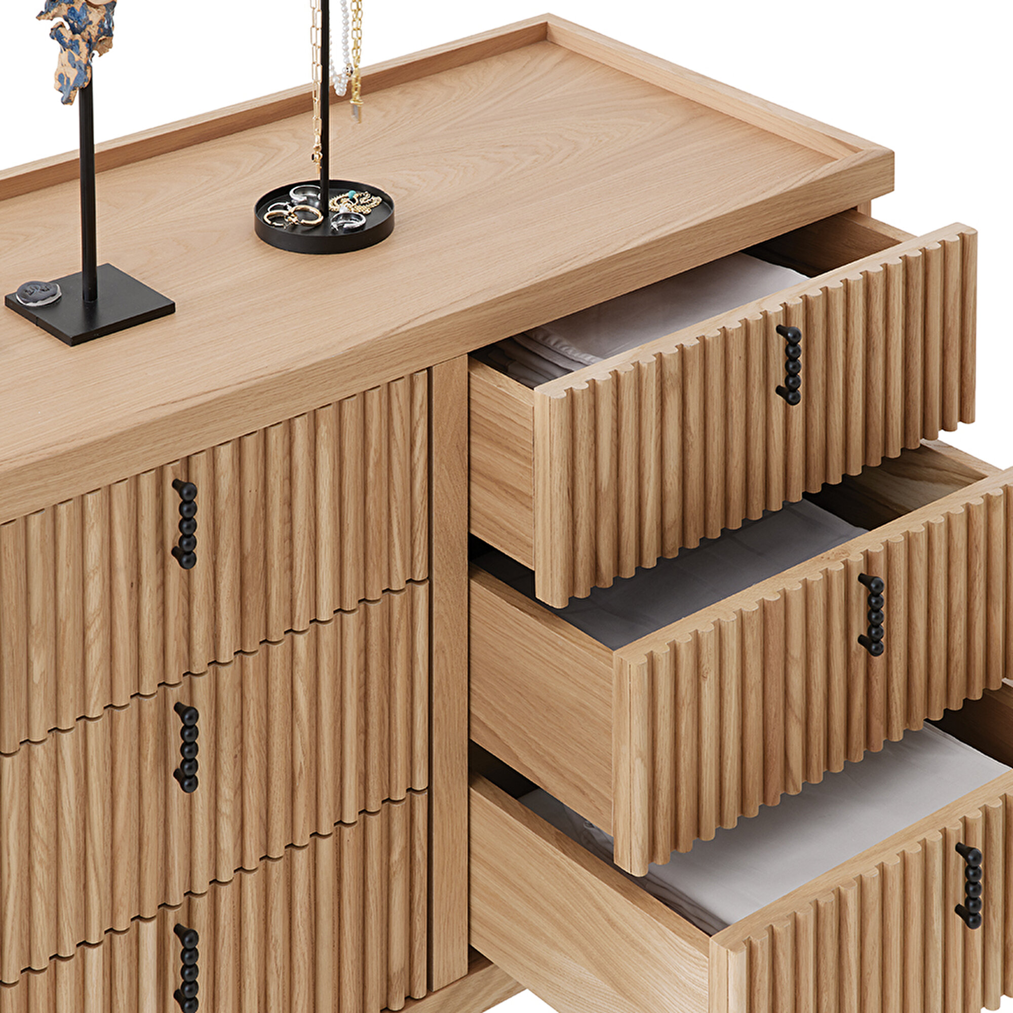 Безупречный цвет Высокий комод Austin, благодаря насыщенному светлому дубу и эффектным полоскам, создаёт яркий визуальный акцент. Специальные разделители в ящиках помогают поддерживать идеальный порядок, добавляя функциональности и элегантности.