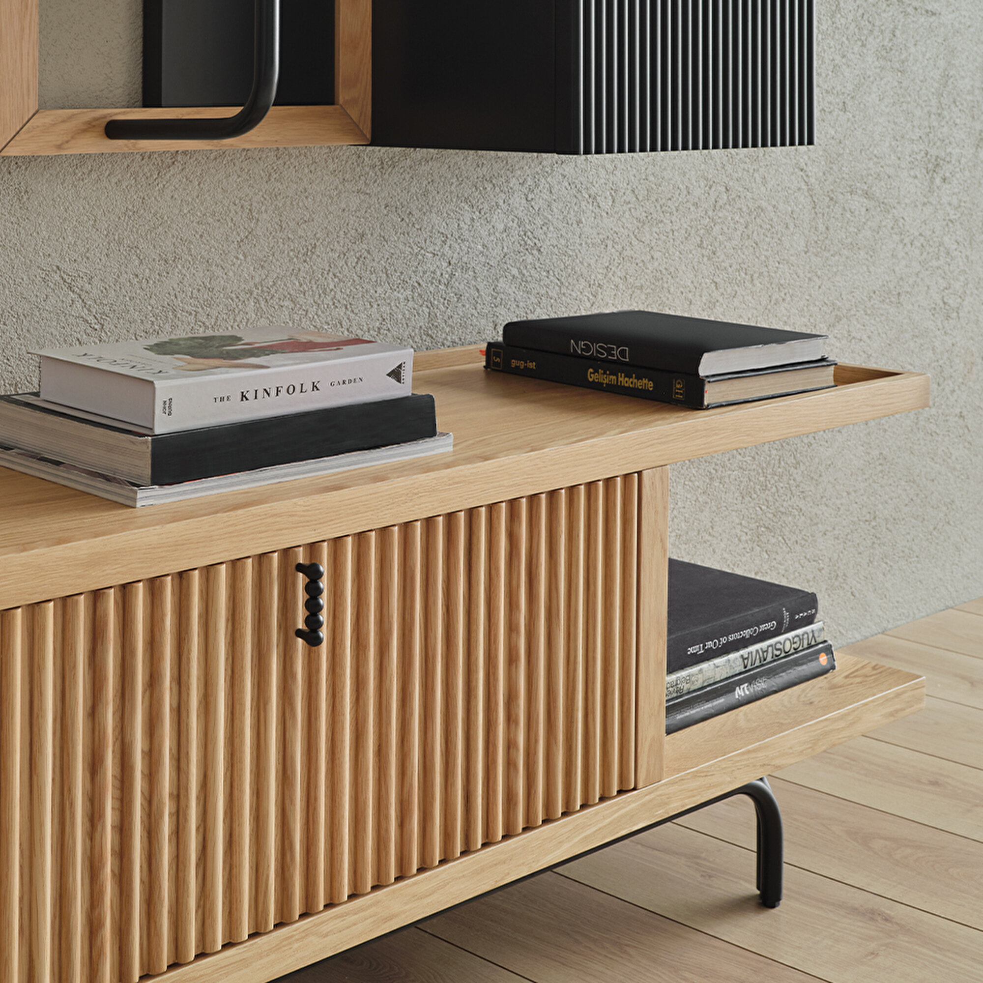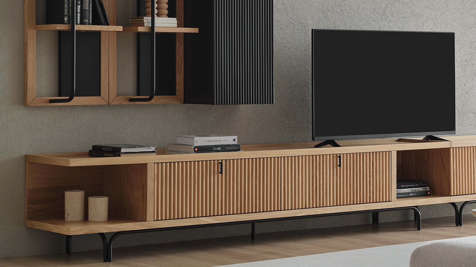 ТВ-стеллаж Austin добавляет эстетичный акцент в жилые пространства своим стильным внешним видом. Детализированная отделка создаёт эффектный визуальный образ. Обивка из МДФ с дубовой отделкой на поверхности усиливает естественный вид стеллажа. Черные металлические ножки и минималистичный дизайн ручек придают мебели лаконичный стиль.