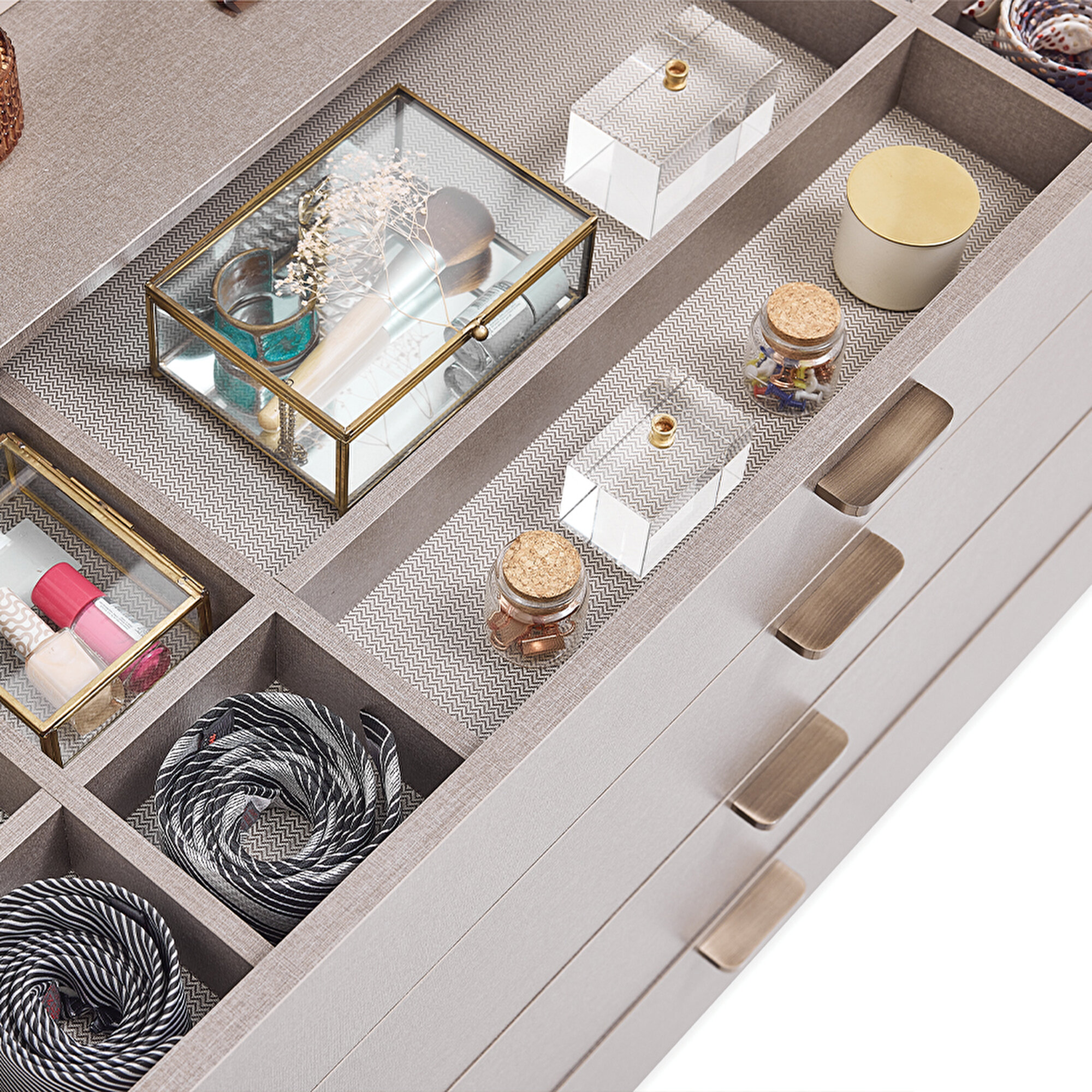 Современный и элегантный комод Berta с высококачественными дизайнерскими деталями, оснащен текстурированным покрытием с металлическими эффектами, эксклюзивными для Enza Home, что придает ему современную и утонченную эстетику. Комод сочетает в себе функциональные преимущества: 4 выдвижных ящика и разделители внутри верхнего ящика для удобной организации хранения. Завершается комод антично-бронзовыми металлическими ручками и подходящими к серийной концепции металлическими ножками, что усиливает его визуальную привлекательность.