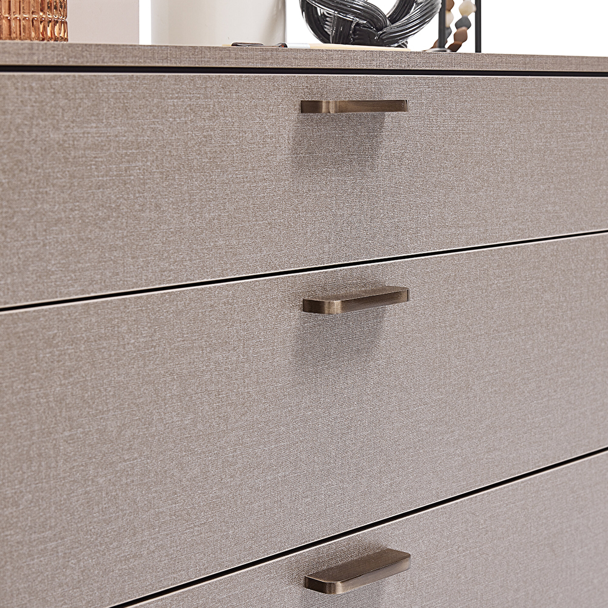 Изысканный вид Комод Berta, с современными и функциональными дизайнерскими линиями, предлагает высокий эстетический уровень. Текстильная отделка с металлическим эффектом, эксклюзивная для Enza Home, придаёт комоду изысканную элегантность, подчёркивая его современный стиль. Особые металлические ножки, гармонирующие с серией, и ручки бронзового цвета добавляют стильные и выразительные акценты в общий дизайн, делая его ярким элементом интерьера.