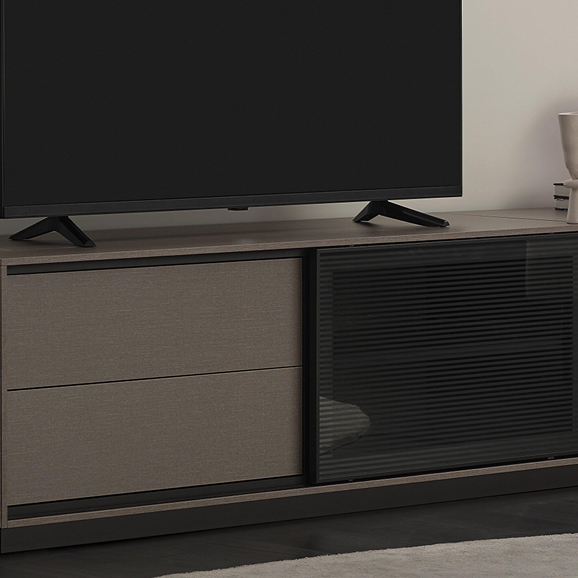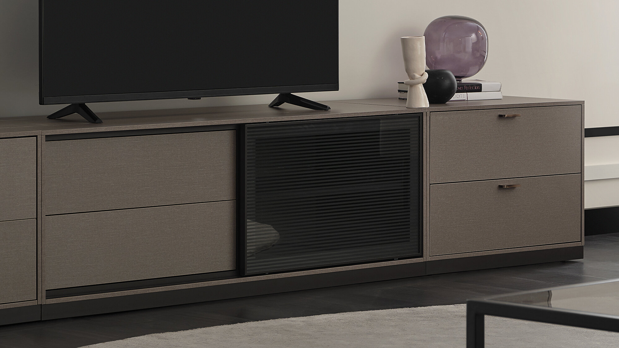 Изысканный вид ТВ-стеллаж Berta с современными и функциональными дизайнерскими линиями привлекает внимание высоким эстетическим уровнем. Текстильная отделка с металлическим эффектом, эксклюзивная для Enza Home, придаёт стеллажу изысканную элегантность и подчёркивает его современный стиль. Особые дизайнерские детали, такие как раздвижные и стеклянные дверцы, создают яркое современное впечатление и привносят стильную интерпретацию в декор.