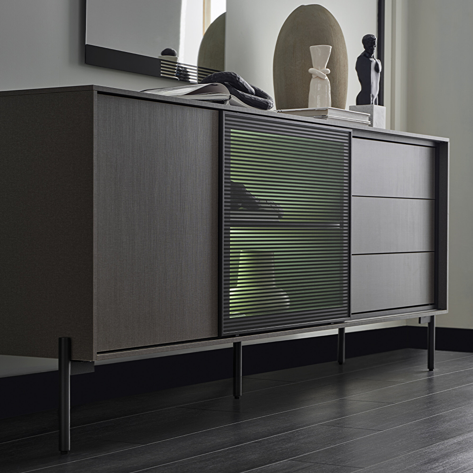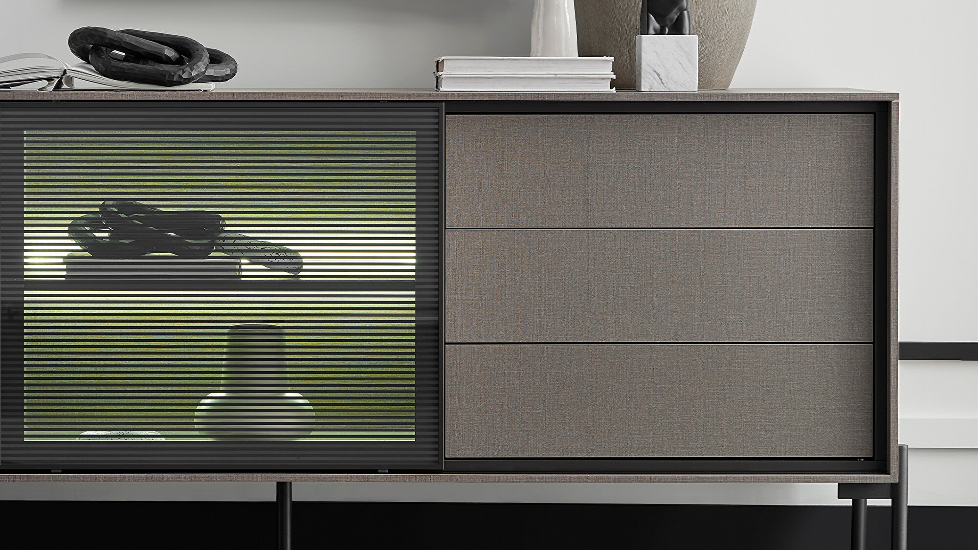 Изысканный вид Сервант Berta, с современными и функциональными дизайнерскими линиями, привлекает высоким эстетическим уровнем. Текстильная отделка с металлическим эффектом, эксклюзивная для Enza Home, придаёт сервант изысканную элегантность и подчёркивает его современный стиль.