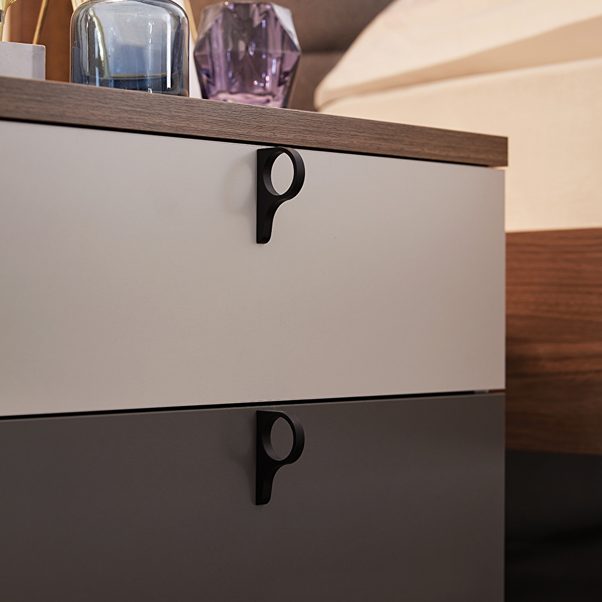 Безупречная и изысканная гармония Прикроватная тумбочка Cordell с матовыми черными металлическими ручками, гармонирующими с коллекцией, идеально дополняет другие предметы мебели, помогая создать современный и спокойный стиль интерьера.