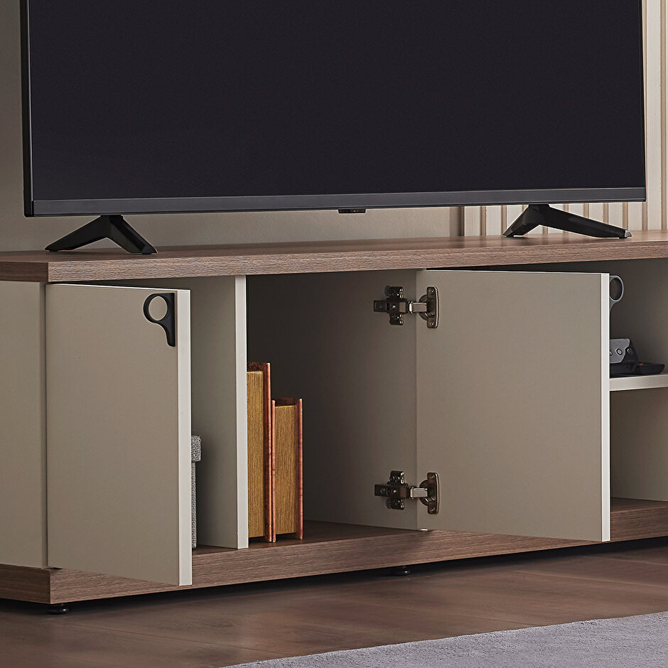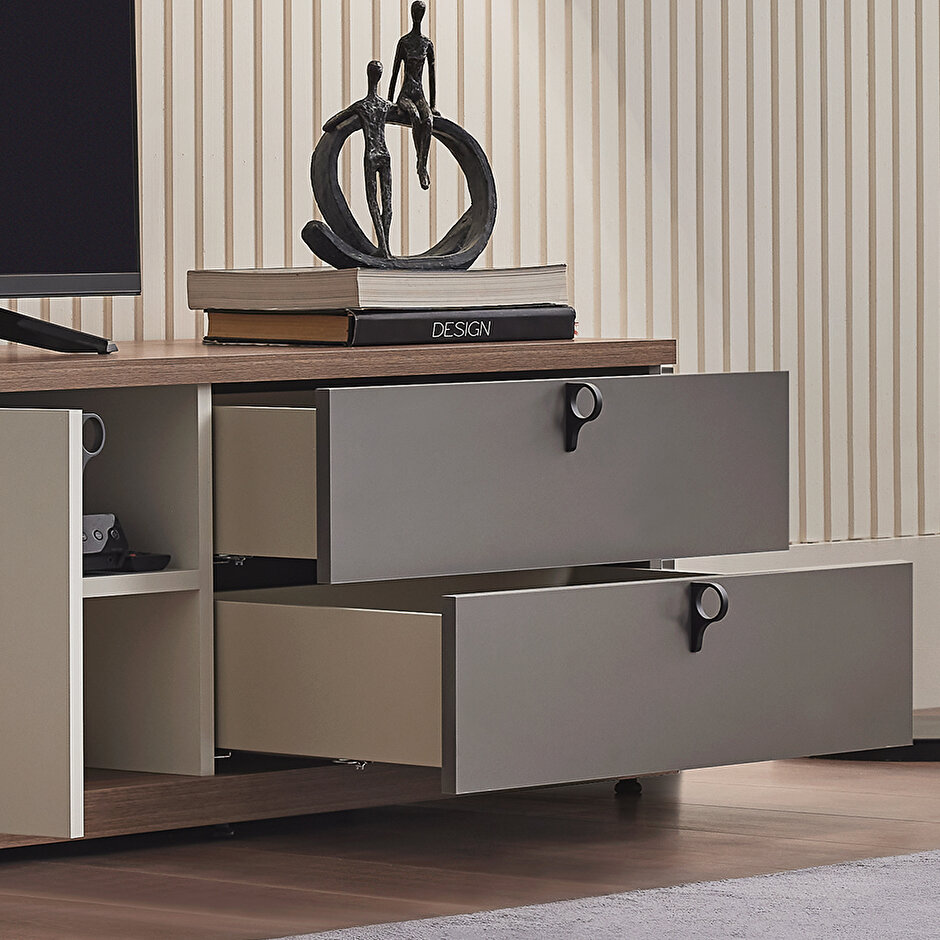 ТВ-стеллаж Cordell с элегантными линиями дизайна и максимальными функциональными преимуществами привлекает внимание благодаря поверхности в ореховом, сером и слоновом цвете, сочетая тепло дерева с натуральной элегантностью.