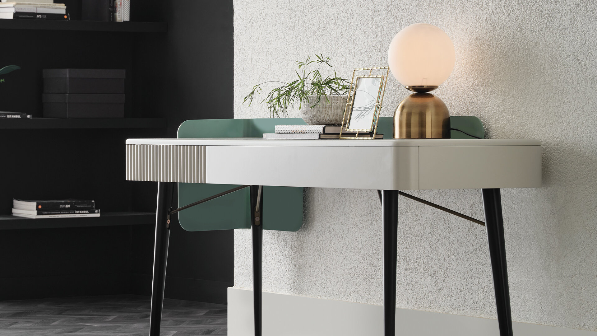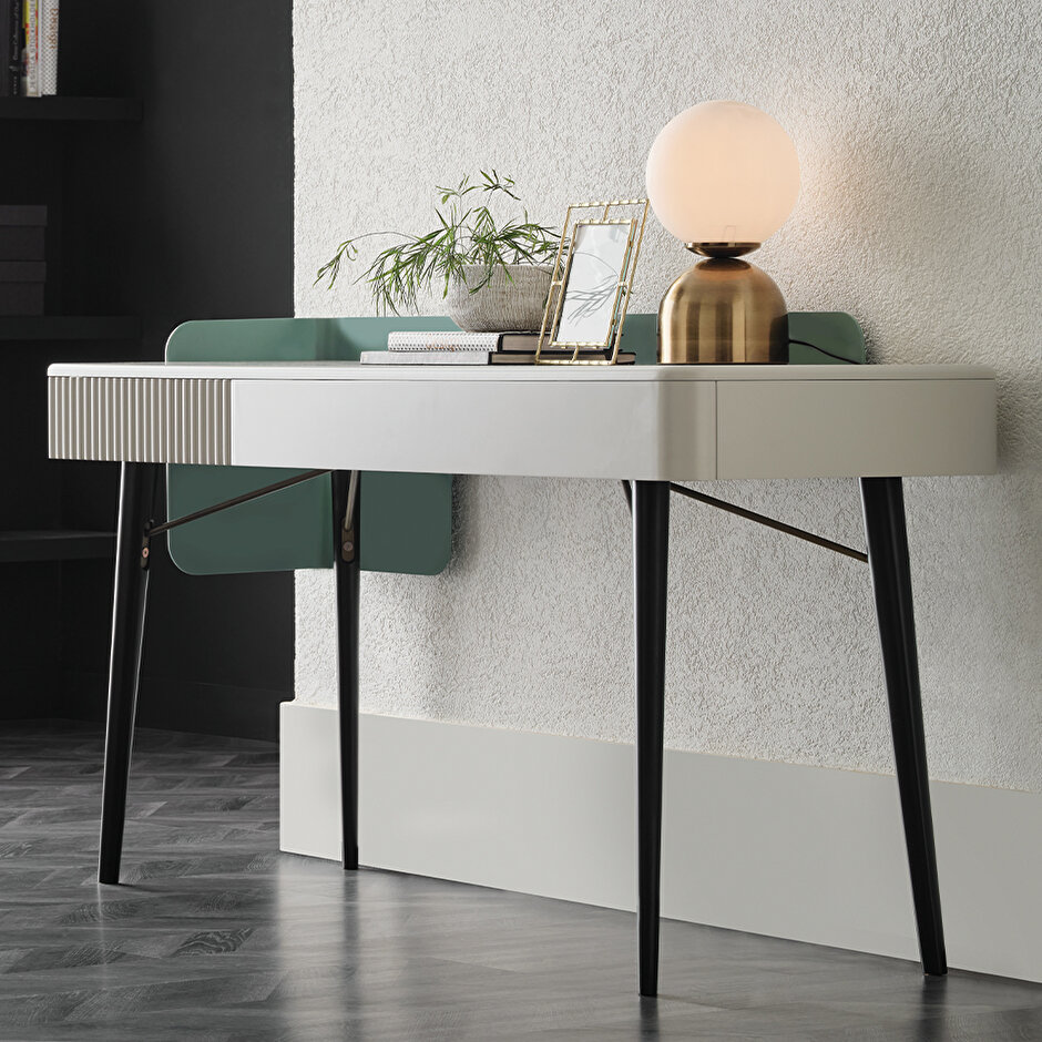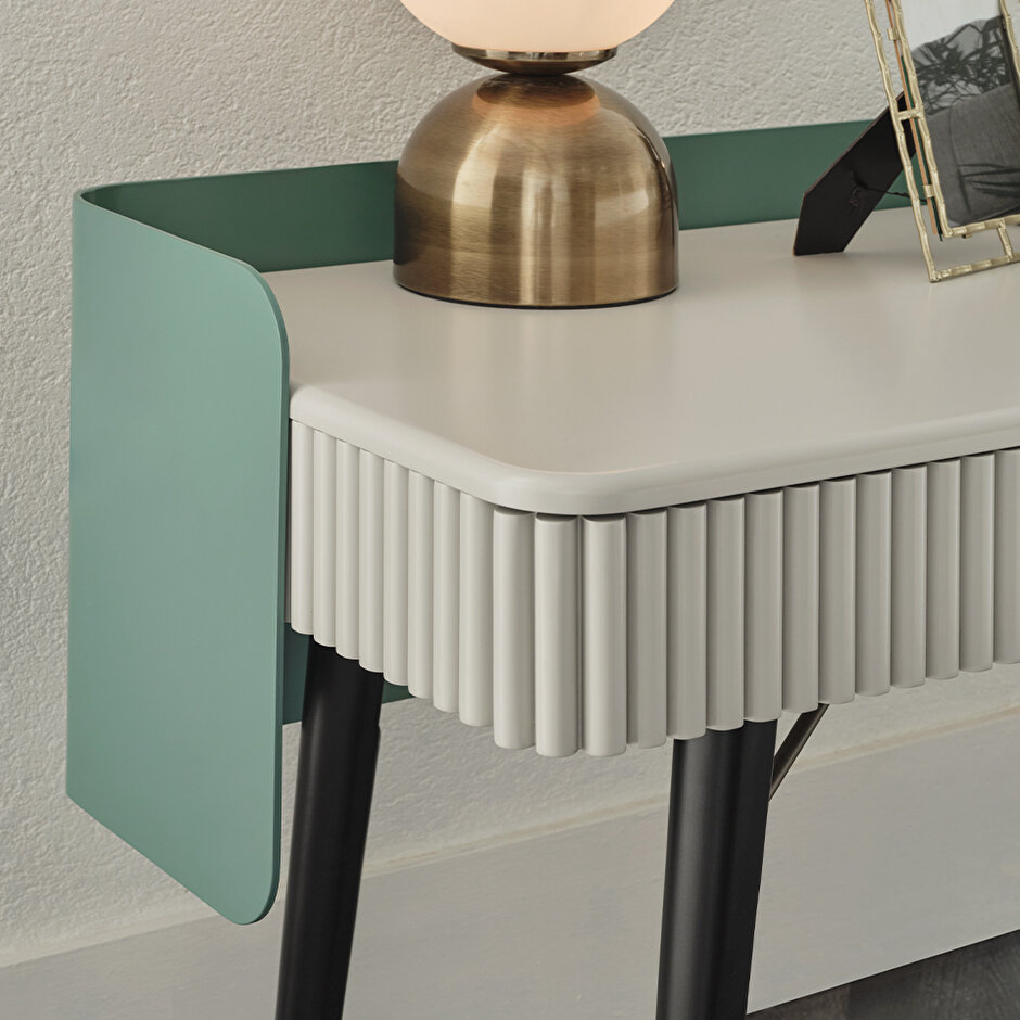 Туалетный столик Dublino предлагает изысканный и утонченный дизайн, создавая современную атмосферу в любом пространстве. Богатство материалов подчеркивается деревянными ножками с металлическими вставками и корпусом из МДФ, создающими эффектный вид. Закругленные формы столика и использование металлических деталей в сочетании с оригинальной цветовой палитрой придают интерьеру стильный и современный акцент.