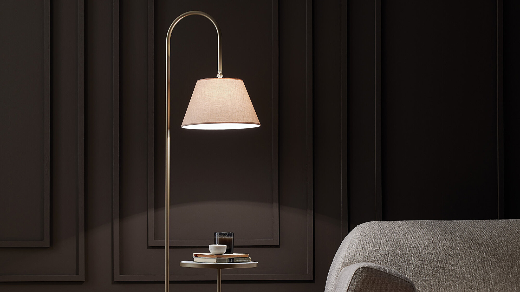 Торшер Epic с эффектным золотым корпусом и бежевым абажуром представляет собой впечатляющий пример современного стиля. Дополненный функцией столика, он сочетает эстетику и практичность, привнося изящный акцент в многофункциональную концепцию нового сезона.