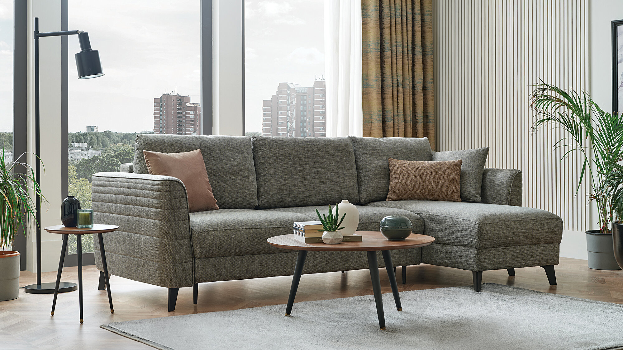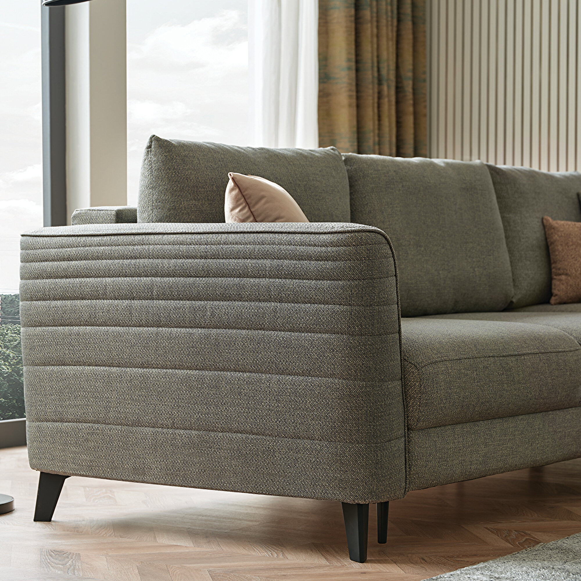 Угловой диван-кровать Grace с функциональным комфортом выделяется своим современным элегантным дизайном. Благодаря просторной зоне для сидения и механизму Enlarge, он легко превращается в широкую кровать, предлагая практичные решения для повседневной жизни. Уникальные декоративные строчки и два варианта ножек — орехового и черного цветов — придают дизайну изысканность. Дополнительное удобство создает встроенный ящик для хранения, обеспечивая дополнительное пространство для вещей.