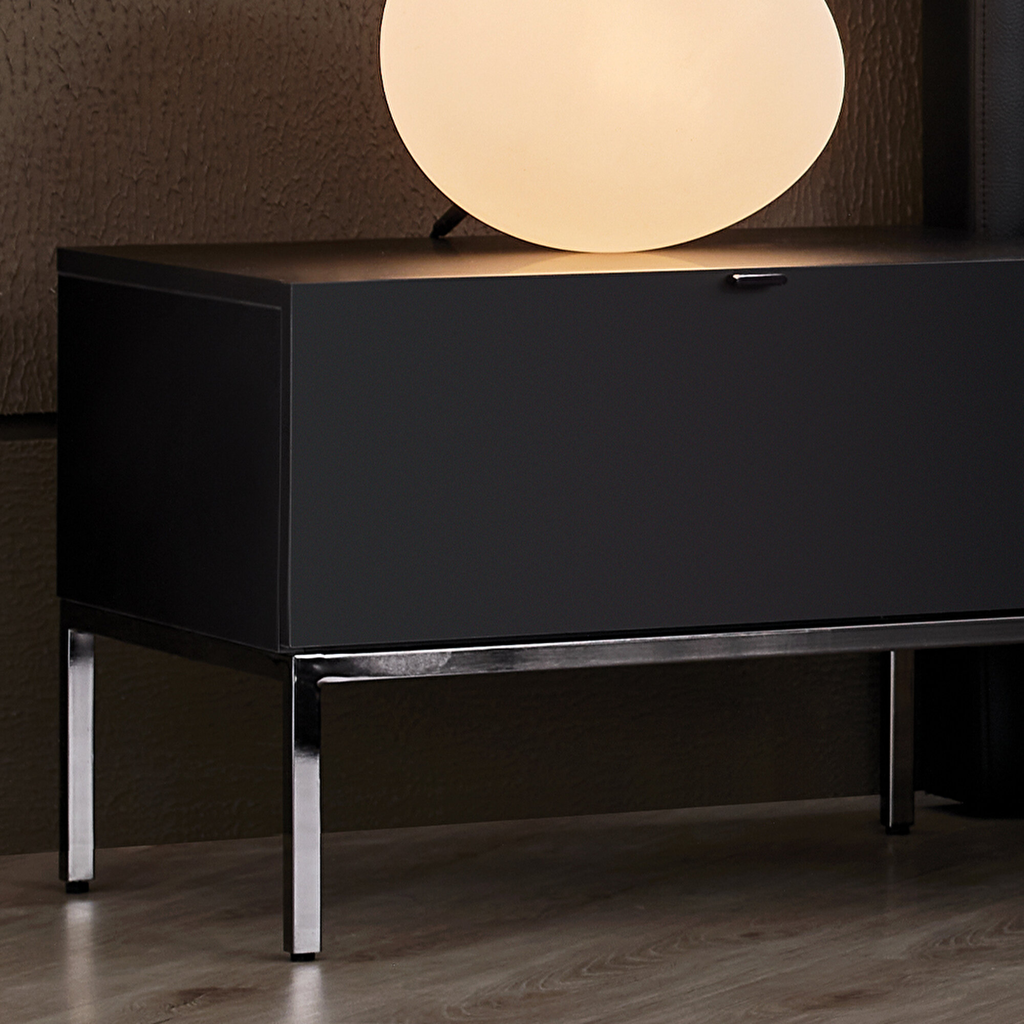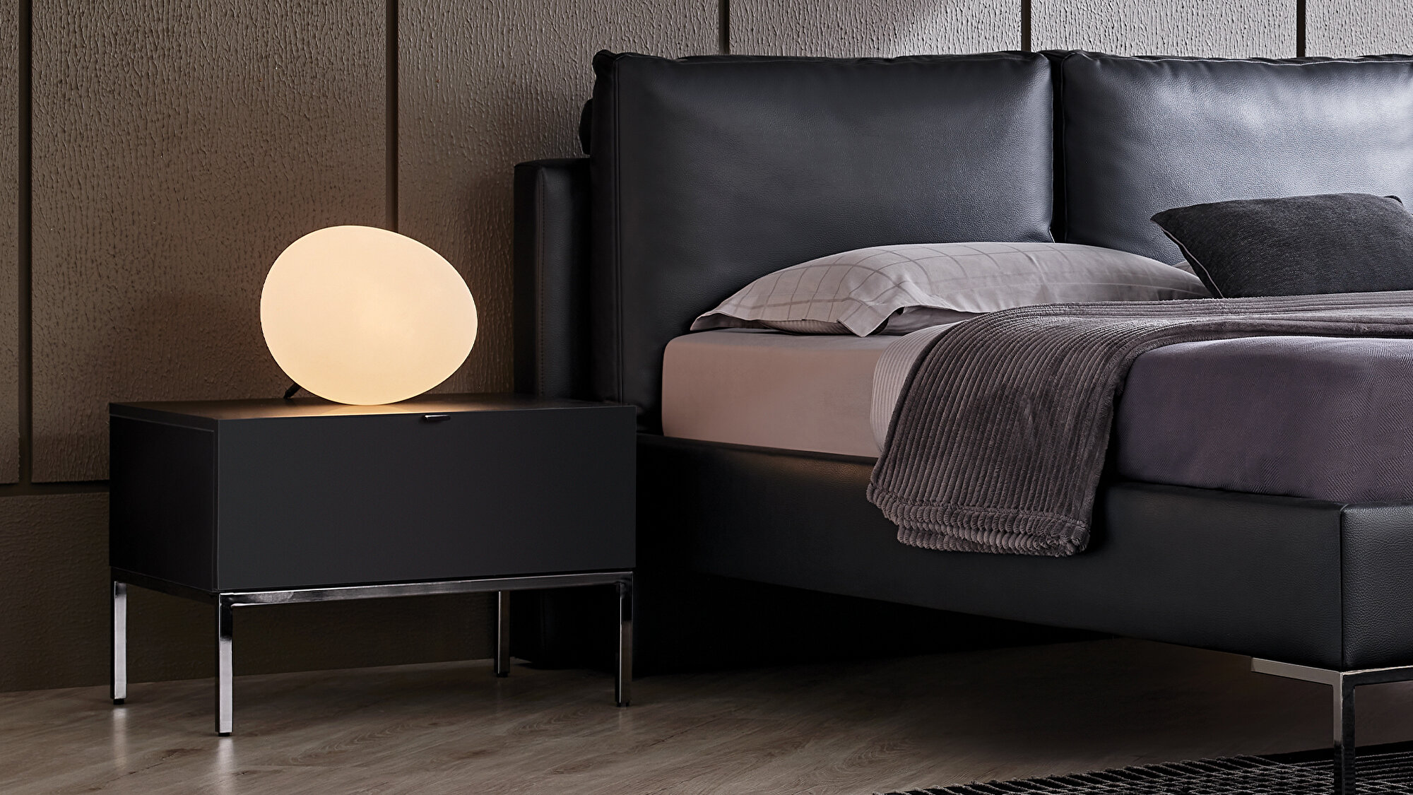Прикроватная тумбочка Legato с уникальным монохромным стилем станет отличным выбором для создания оригинального декора спальни. Современные и стильные детали, такие как матовая чёрная поверхность и минималистичные графитовые металлические ручки и ножки, акцентируют элегантность. Монохромный стиль с ярко выраженным матовым чёрным цветом меняет атмосферу спальни, придавая ей особый шарм.