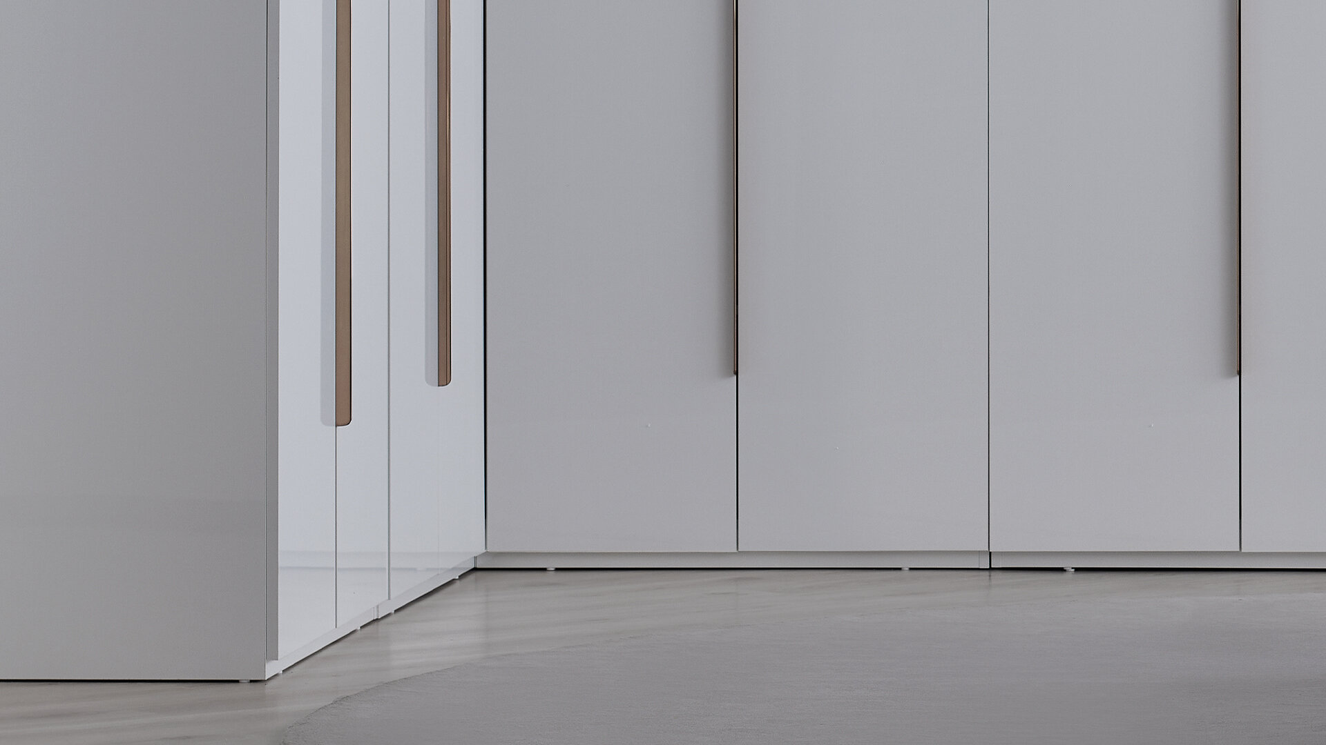 Привлекательные цветовые детали В модели шкафа Legato глянцевые белые поверхности сочетаются с длинными блестящими металлическими ручками бронзового цвета. Элегантные ручки, привлекающие внимание своим дизайном, также выделяются своей прочной конструкцией.