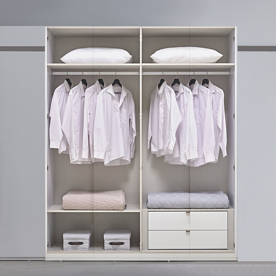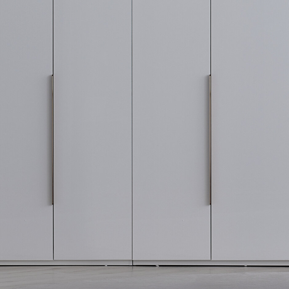 Четырехдверный шкаф Legato с современным молодежным дизайном привносит динамичную атмосферу в спальню. Монохромный стиль шкафа, часто используемый в интерьерах, подчеркивает элегантность благодаря длинным блестящим бронзовым металлическим ручкам и глянцевой белой поверхности. Просторные отделения для хранения обеспечивают удобство и функциональность. Модульная структура шкафа Legato позволяет создавать различные комбинации, адаптируя его под размеры помещения.
