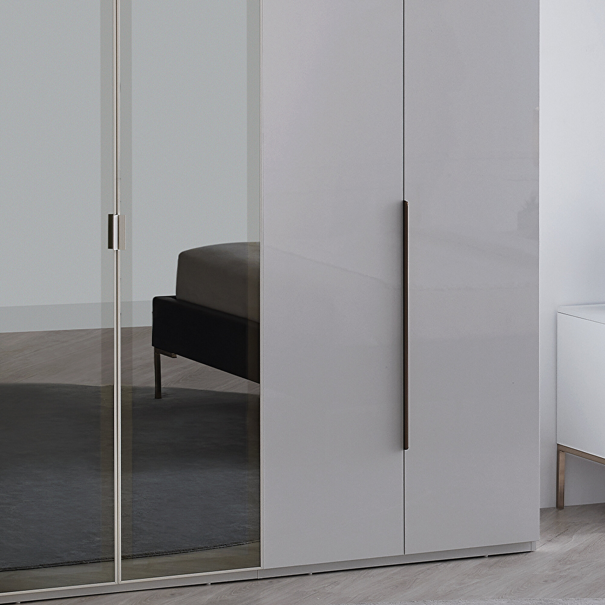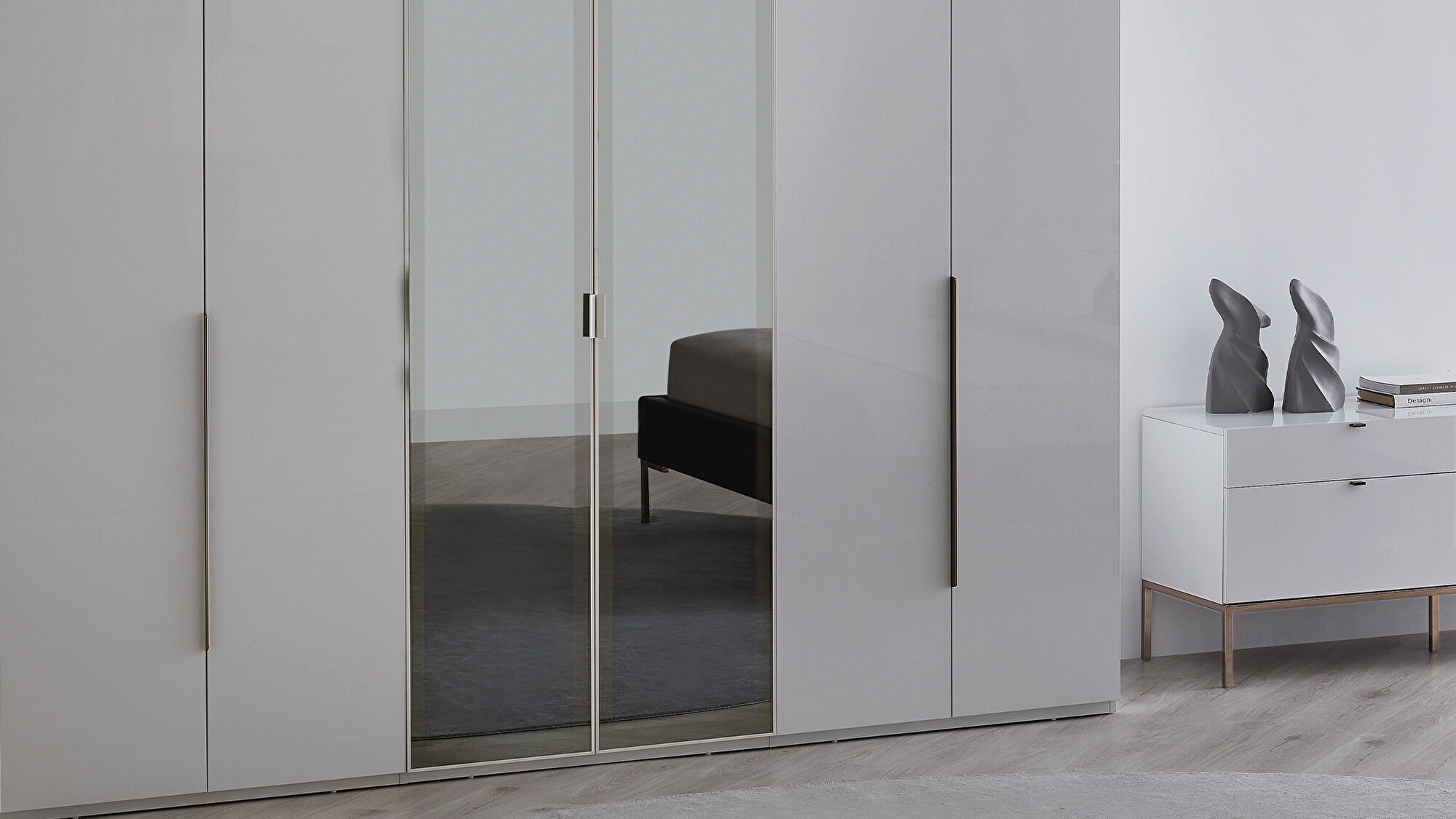 Привлекательные цветовые детали В модели шкафа Legato глянцевые белые поверхности сочетаются с длинными блестящими металлическими ручками бронзового цвета. Элегантные ручки, привлекающие внимание своим дизайном, также выделяются своей прочной конструкцией.