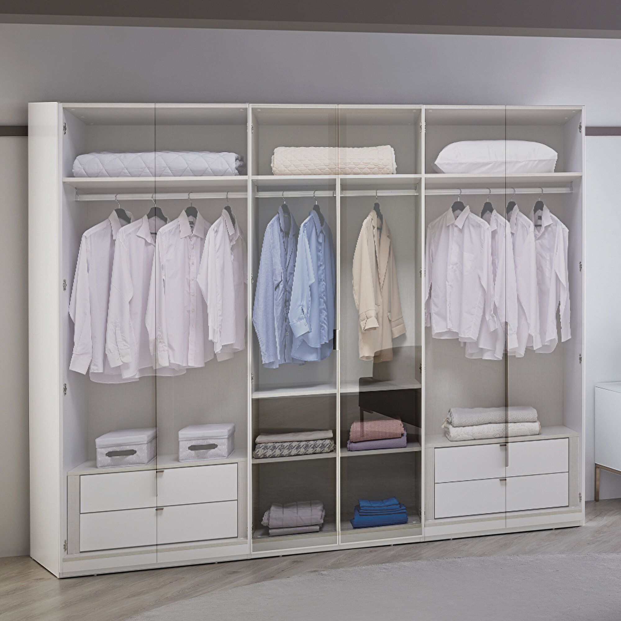 Шестидверный шкаф Legato с современным молодежным дизайном привносит динамичную атмосферу в спальню. Монохромный стиль шкафа, часто используемый в интерьерах, подчеркивает элегантность благодаря длинным блестящим бронзовым металлическим ручкам и глянцевой белой поверхности. Просторные отделения для хранения обеспечивают удобство и функциональность. Модульная структура шкафа Legato позволяет создавать различные комбинации, адаптируя его под размеры помещения.
