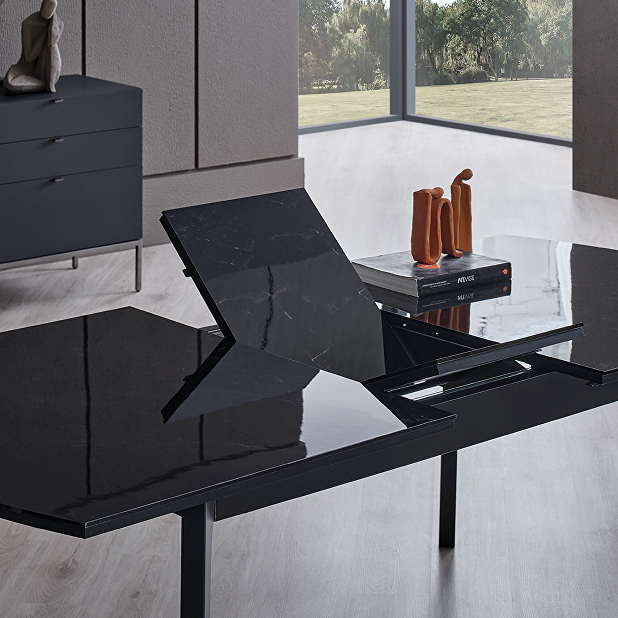 Детали, подчеркивающие элегантность Раздвижной стол Legato привносит в столовую зону современную и элегантную атмосферу благодаря поверхности с мраморным узором. Модель сочетает в себе стиль и практичность, обеспечивая удобство в использовании.