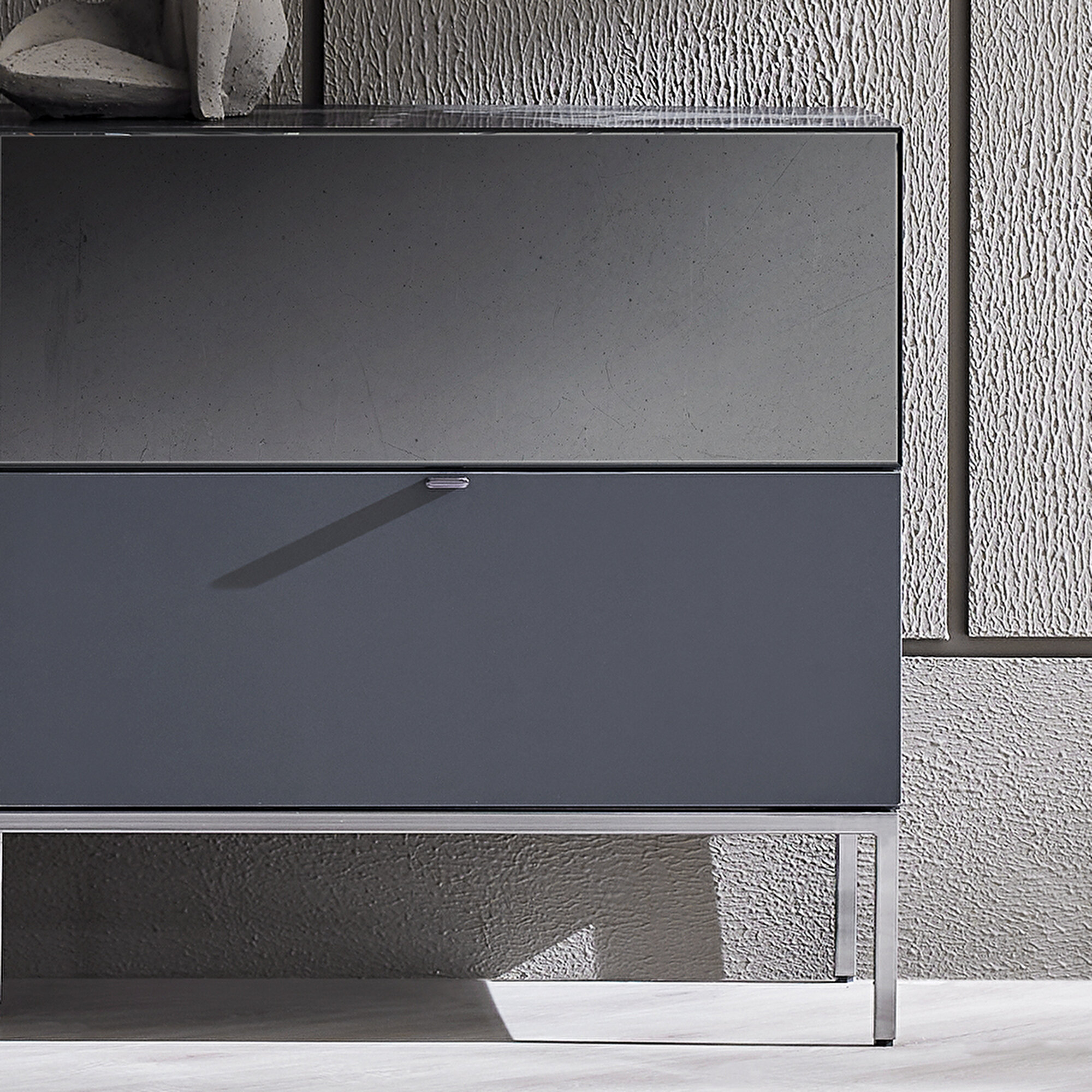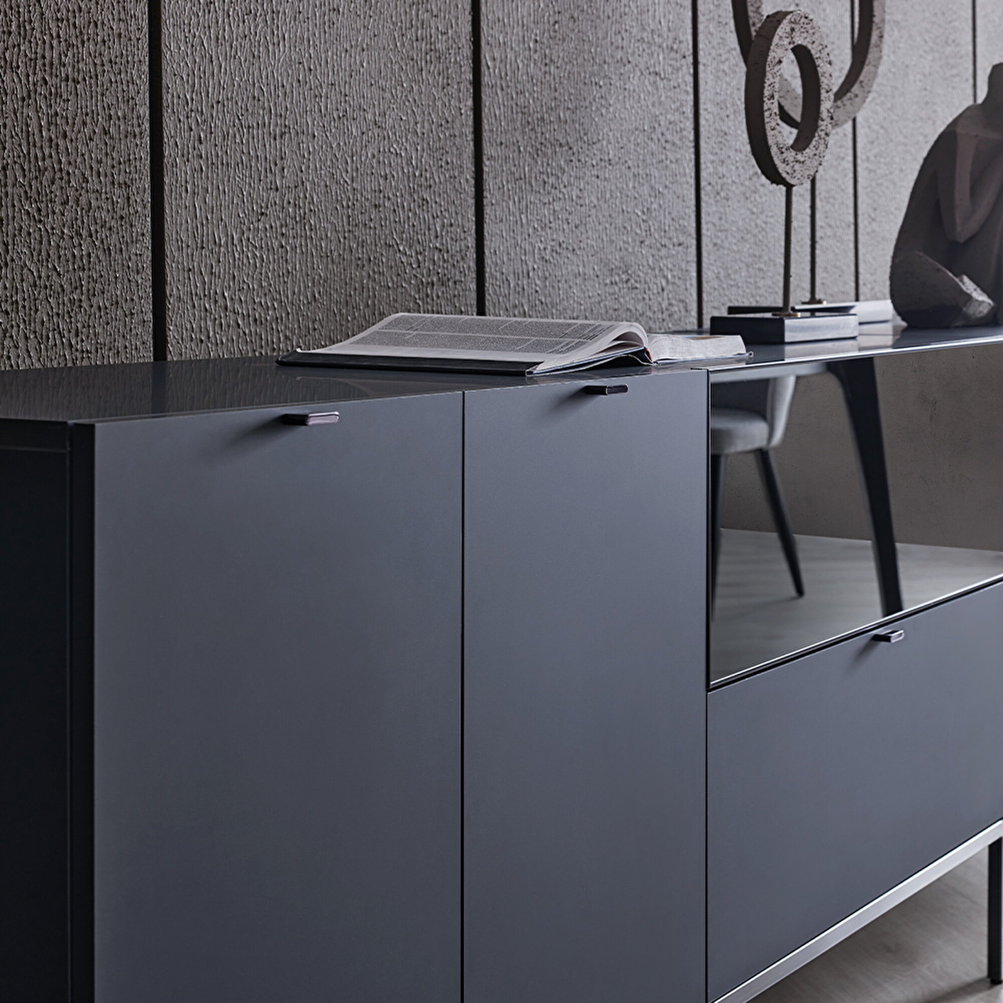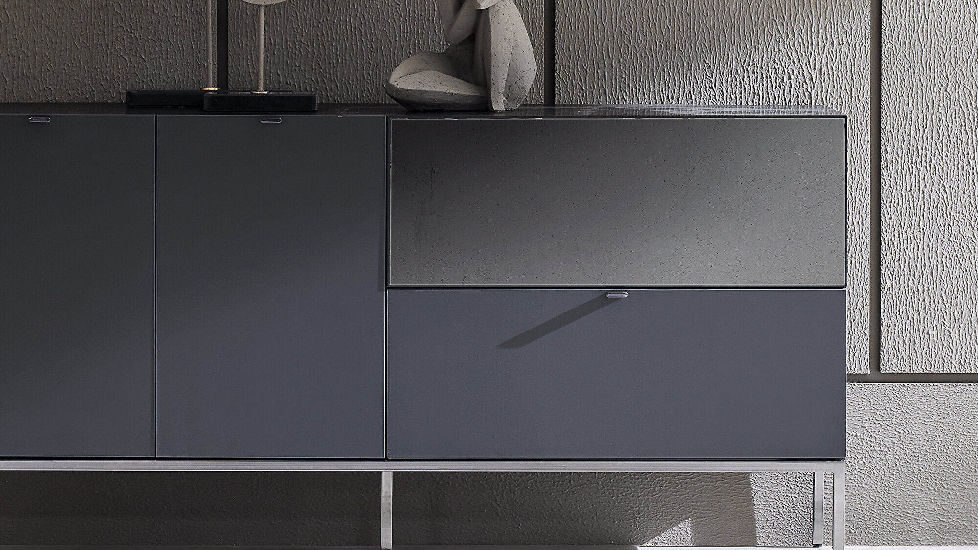 Элементы с характером Сервант Legato с минималистичными металлическими ручками и ножками графитового цвета элегантно завершает коллекцию. Детали с отражающим тёмным стеклом и дверцы с опускающимся механизмом придают дизайну изысканность и элегантность.