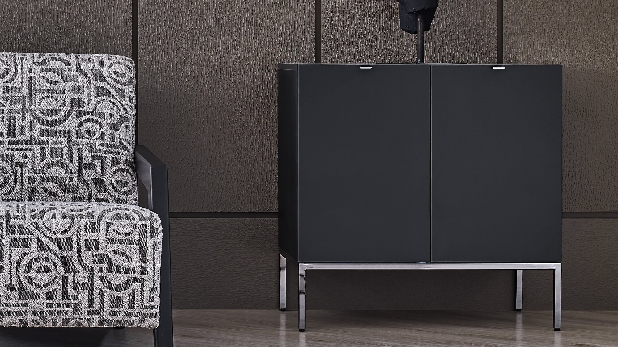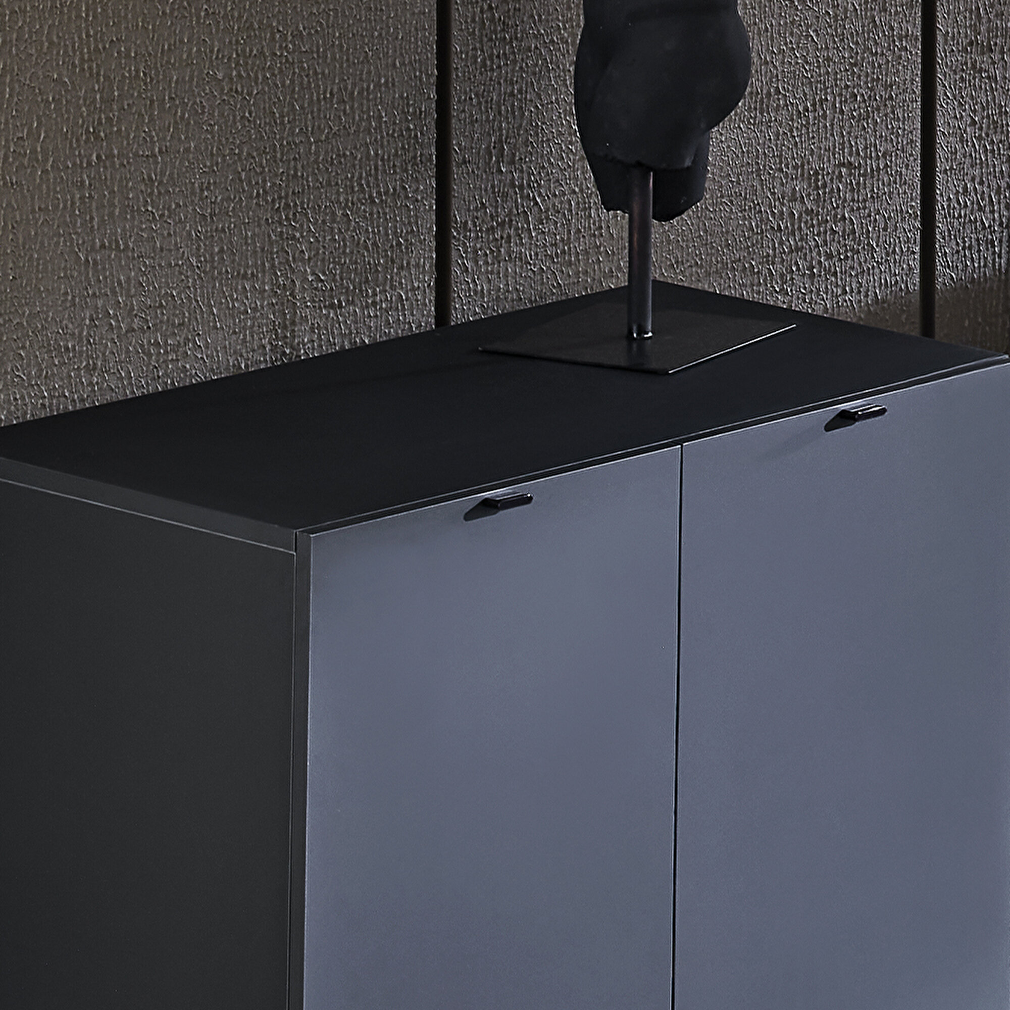 Двухдверный модуль Legato привлекает внимание своими стильными деталями, создавая гармоничный монохромный стиль в интерьере. Матовая черная поверхность прекрасно сочетается с другими мебельными предметами, а минималистичные графитовые металлические ручки и ножки придают элегантность и комфорт. Благодаря возможности комбинирования с другими модулями, Legato легко адаптируется под любое пространство, идеально подстраиваясь под особенности помещения.