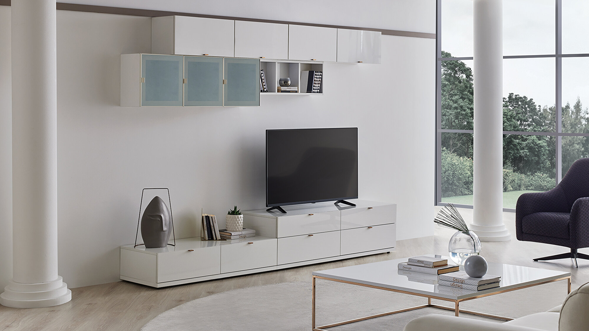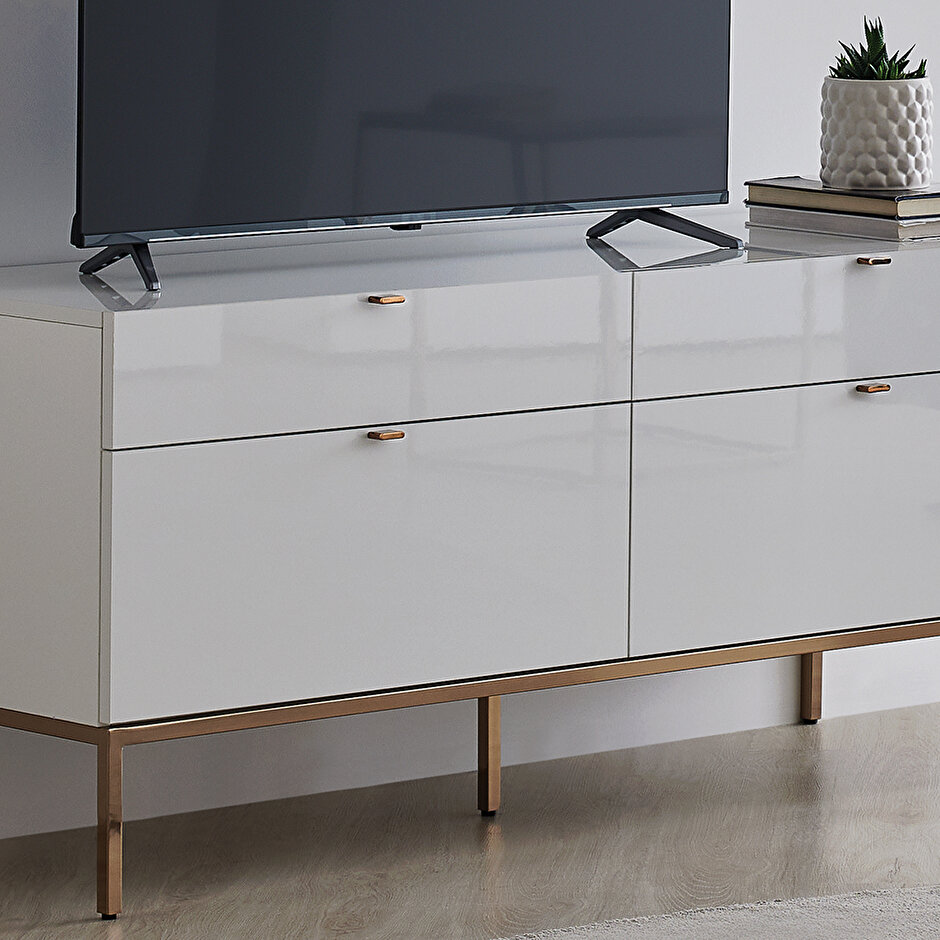 ТВ-стеллаж Legato с многофункциональными модулями позволяет создавать различные комбинации, соответствующие разнообразным потребностям. Проектирование с акцентом на хранение, модульные ящики обеспечивают максимальную функциональность. С глянцевой белой поверхностью и неподвластной времени эстетикой монохромного стиля, ТВ-стеллаж Legato формирует динамичные, уникальные и современные жилые пространства, сочетая стиль и практичность.