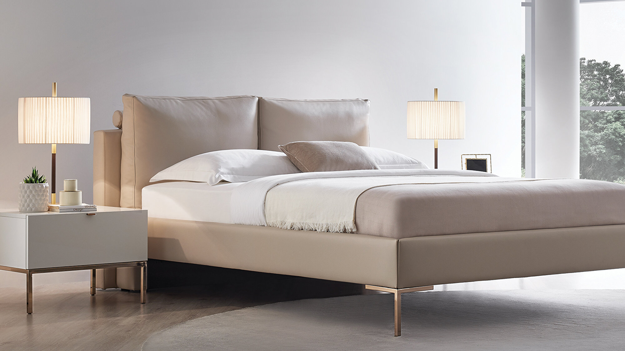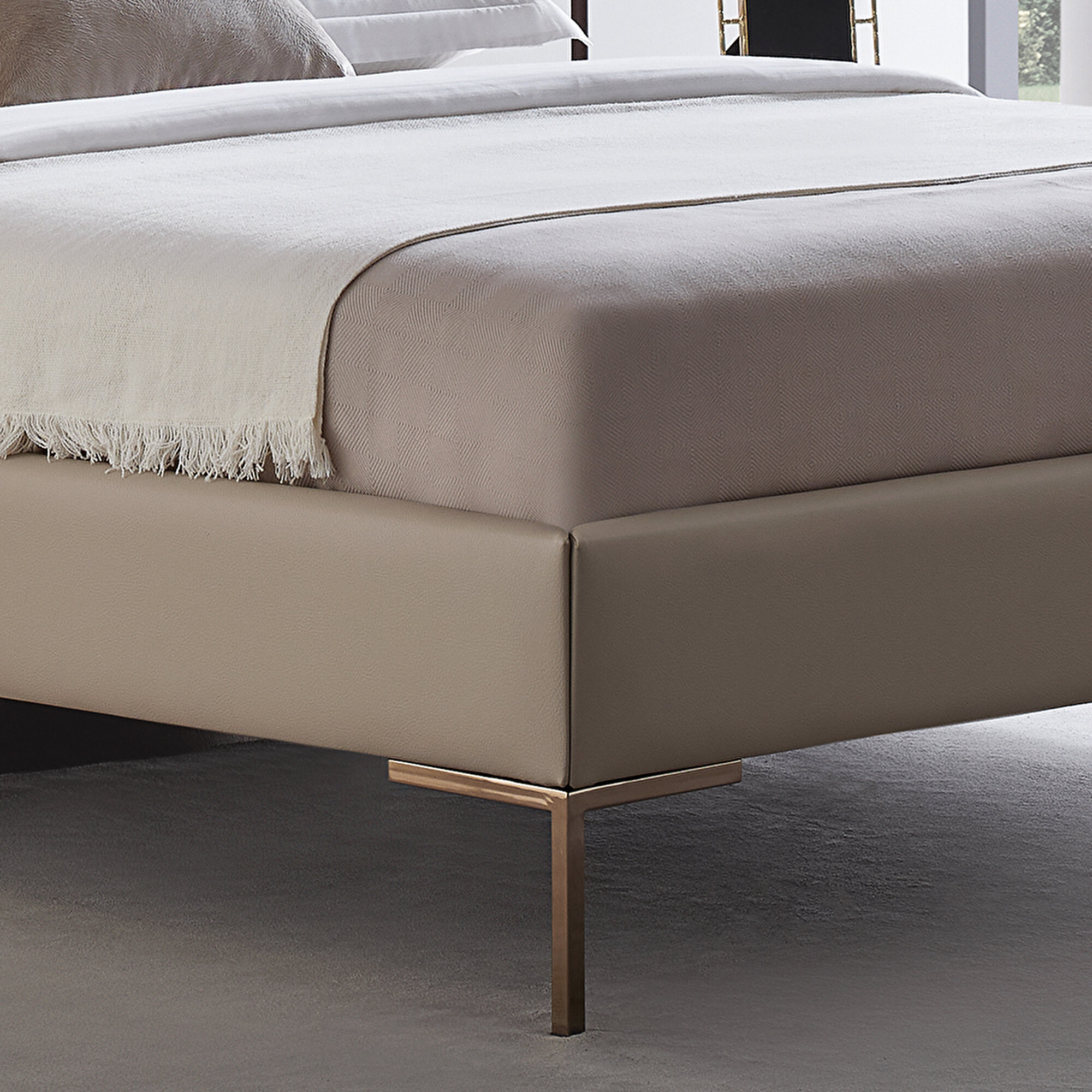 Гармоничный и элегантный вид Основание кровати с изголовьем Legato с бронзовыми металлическими ножками, вдохновленное современным индустриальным стилем, идеально вписывается в стильные и сбалансированные интерьеры. Мягкая тканевая обивка дополняет комфортную атмосферу, подчеркивая элегантность дизайна.