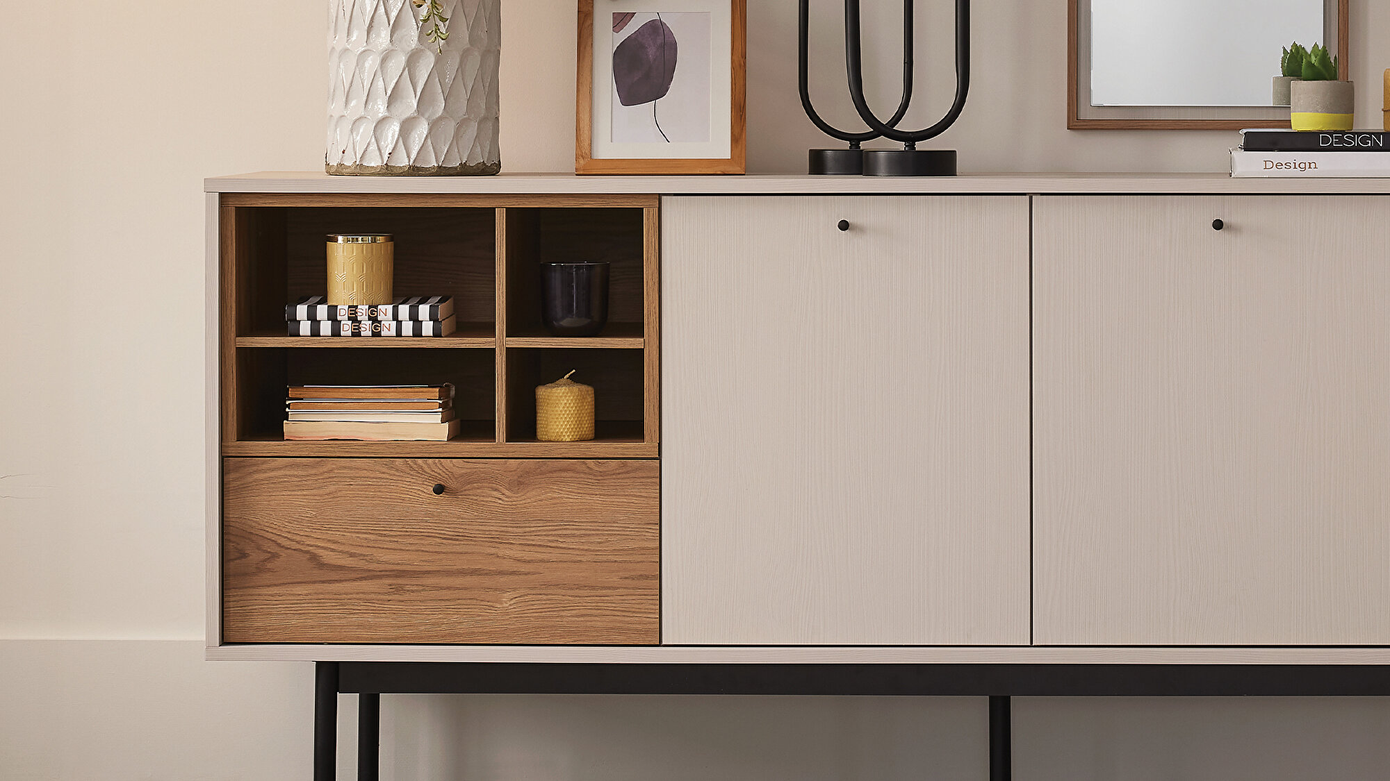 Сервант Loreto с динамичным дизайном и натуральной эстетикой гармонично дополняет современный индустриальный интерьер, привнося в пространство тепло и характер.