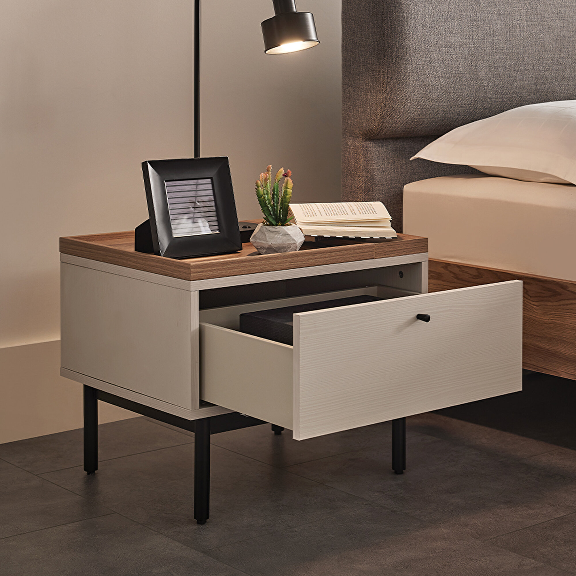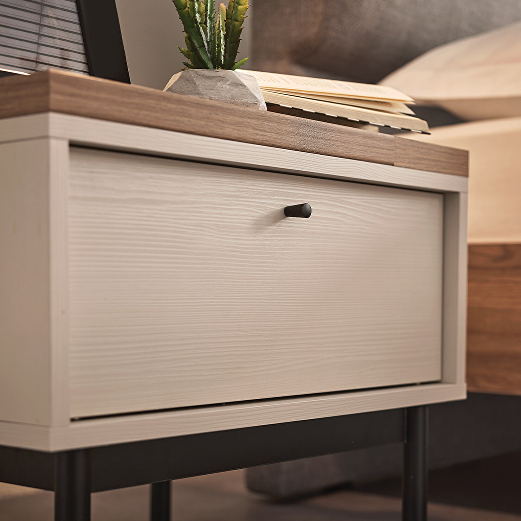 Прикроватная тумбочка Loreto привносит в интерьер спальни стиль и элегантность благодаря современному дизайну. Её утончённые линии подчёркивают эстетику индустриального стиля, а сочетание оттенков светлого ореха и слоновой кости придаёт естественную гармонию. Длинные матовые чёрные металлические ручки, идеально дополняющие коллекцию, становятся стильным акцентом, отражающим натуральную эстетику пространства.