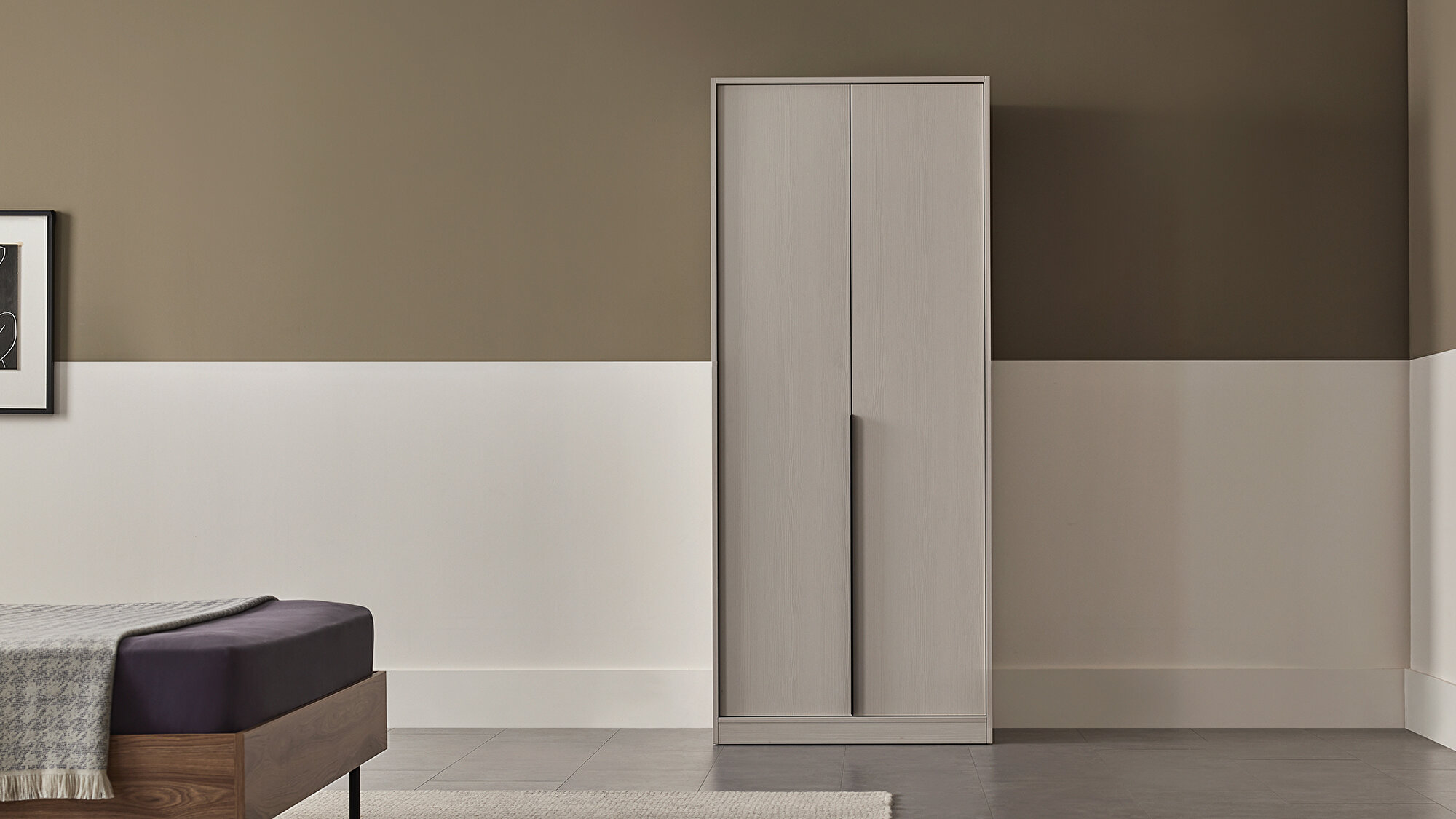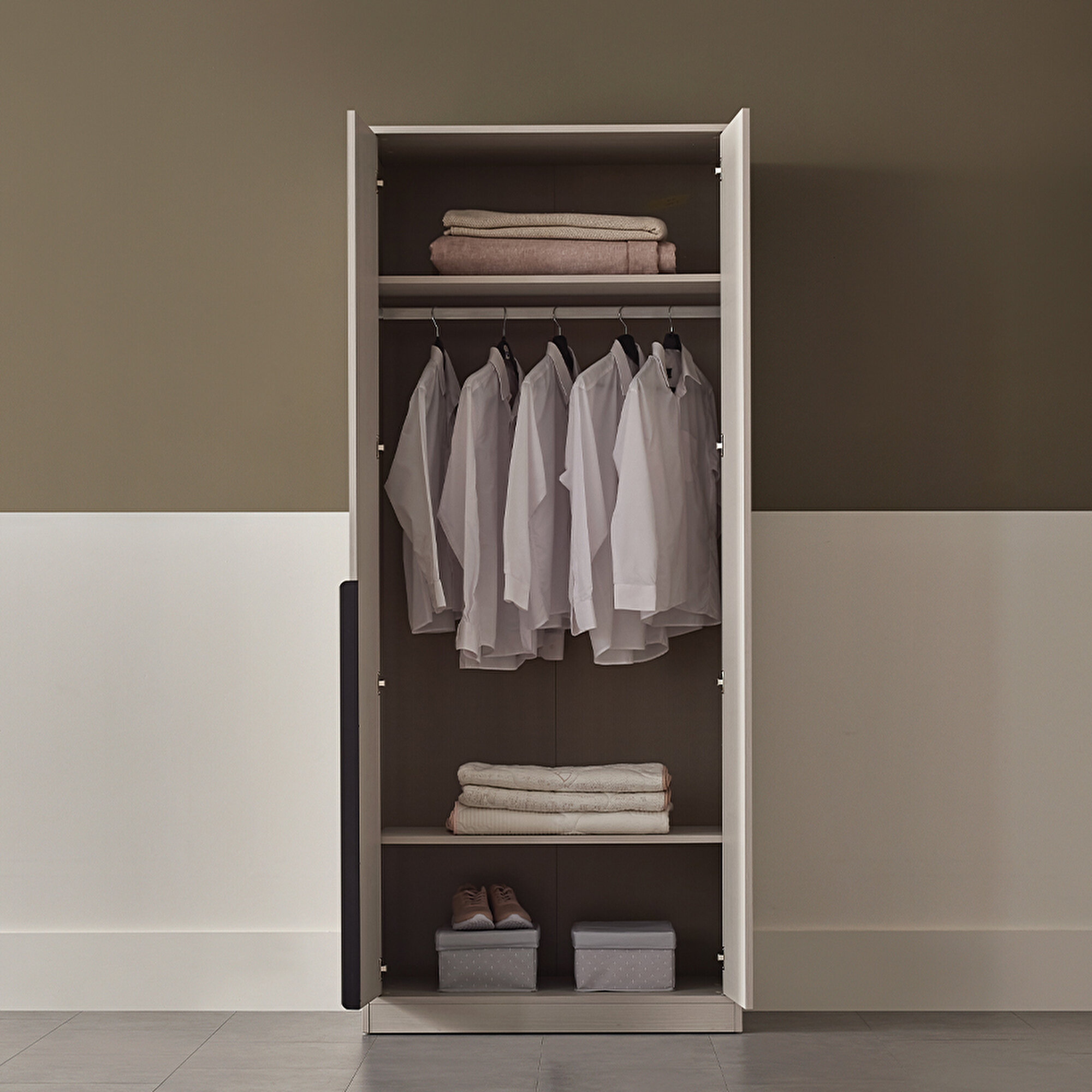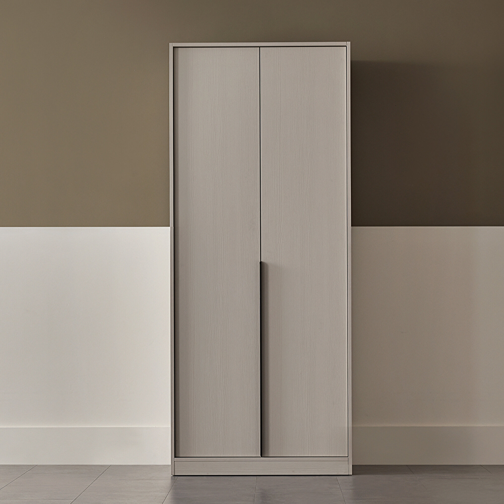 Двухдверный шкаф Loreto сочетает оттенки светлого ореха и слоновой кости, привнося в интерьер природную эстетику. Текстурированные поверхности и матовые чёрные металлические ручки подчёркивают естественный стиль, создавая гармоничный акцент. Система плавного закрывания петель и направляющих обеспечивает удобство в использовании.