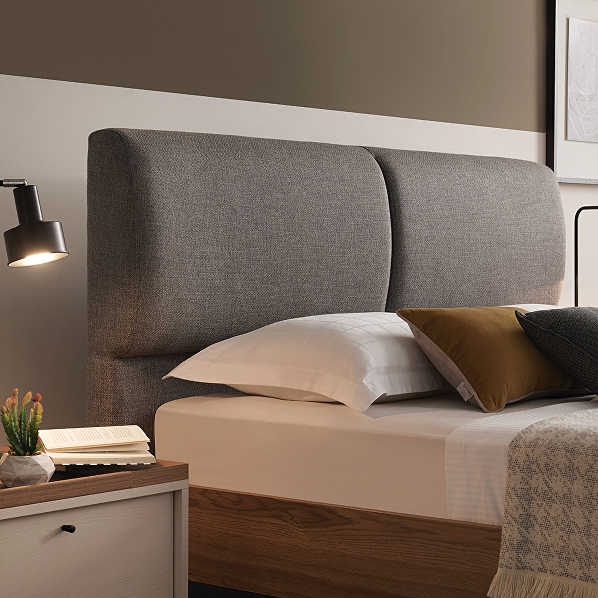 Основание кровати с изголовьем Loreto гармонично сочетает лаконичность и современность, создавая уютную атмосферу и подчеркивая комфорт коллекции. Пуф с декоративной строчкой и черные металлические ножки образуют стильное и функциональное единство. Высокие ножки облегчают уборку, добавляя изделию практичности и удобства.