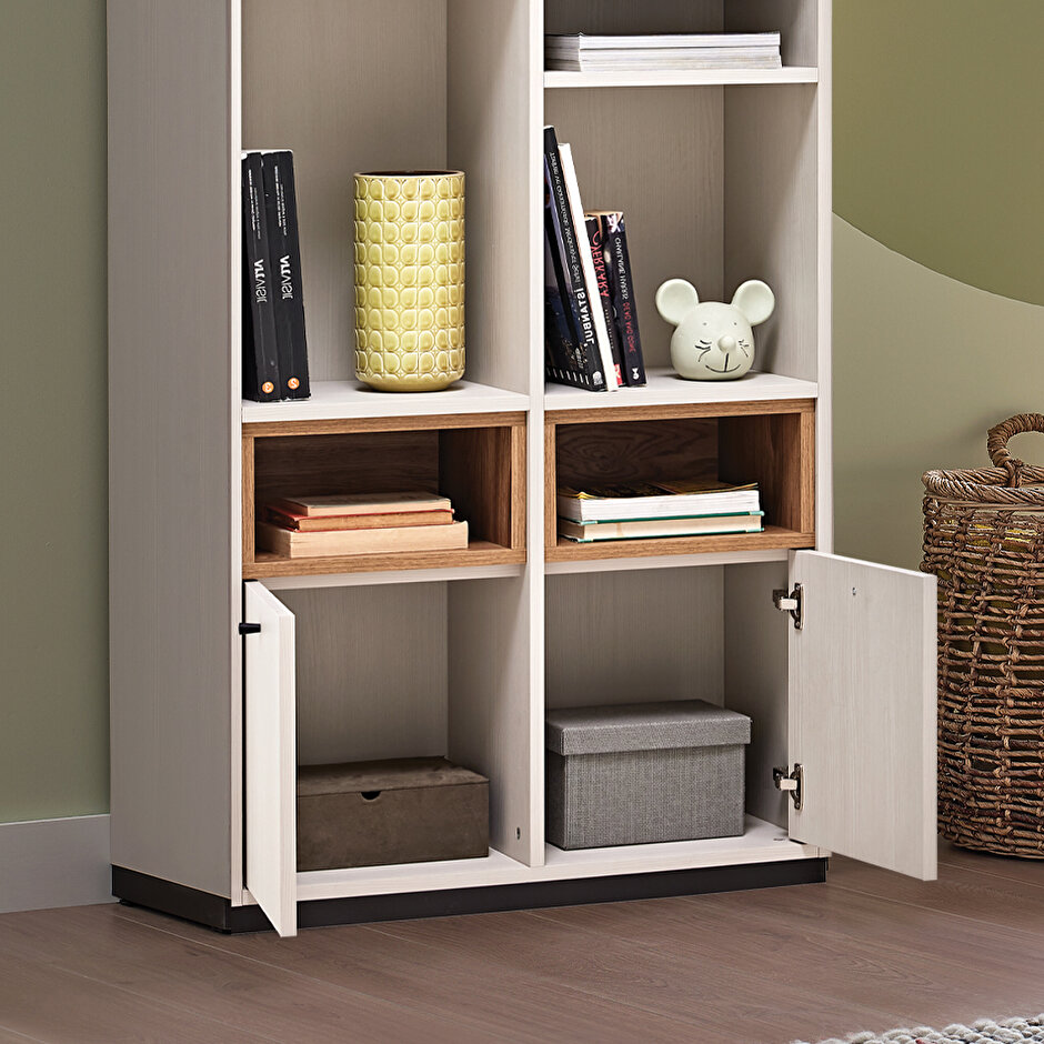 Функциональные детали Книжный шкаф Loreto с открытыми полками и двумя закрытыми полками создаёт плавный переход между горизонтальными и вертикальными зонами хранения, увеличивая функциональность.