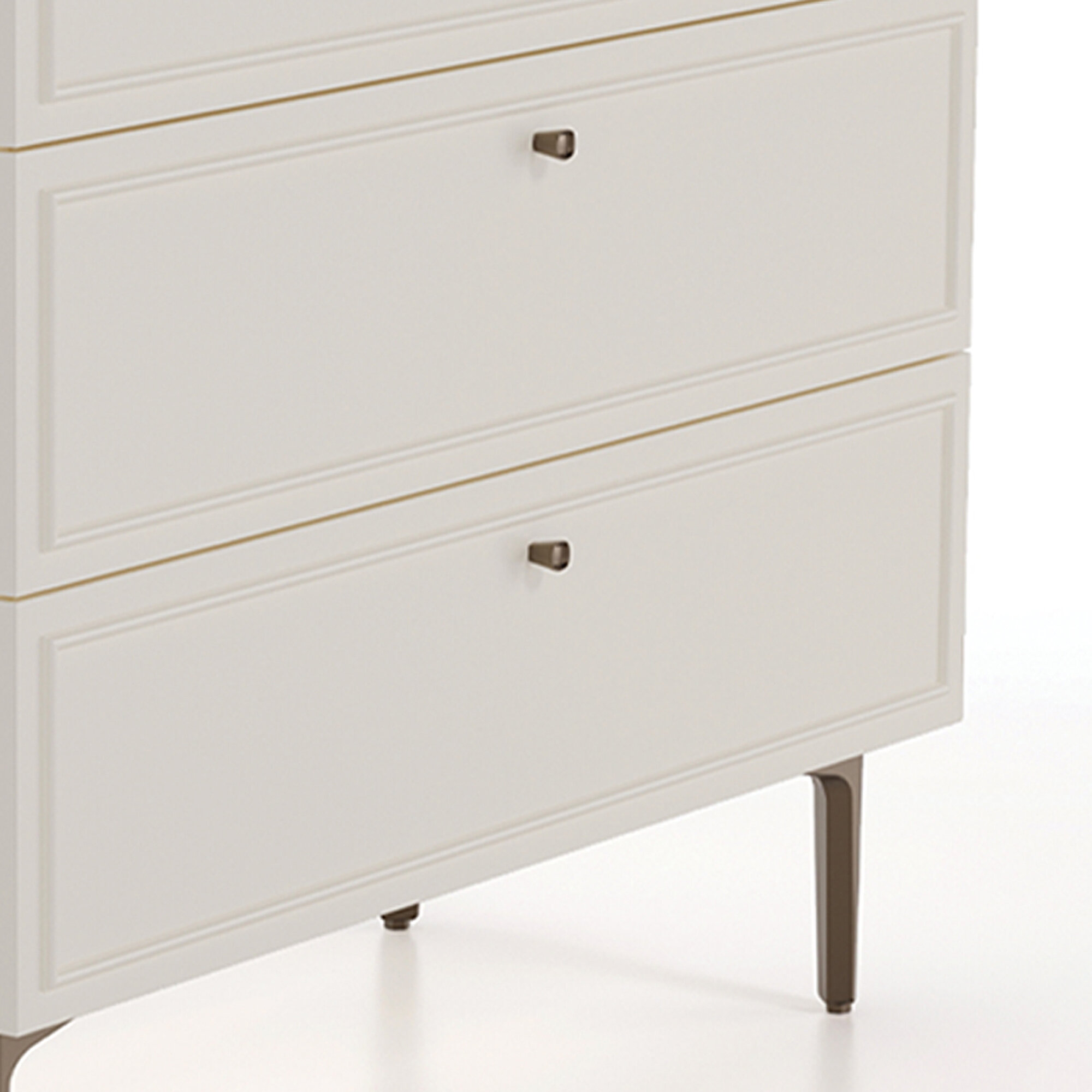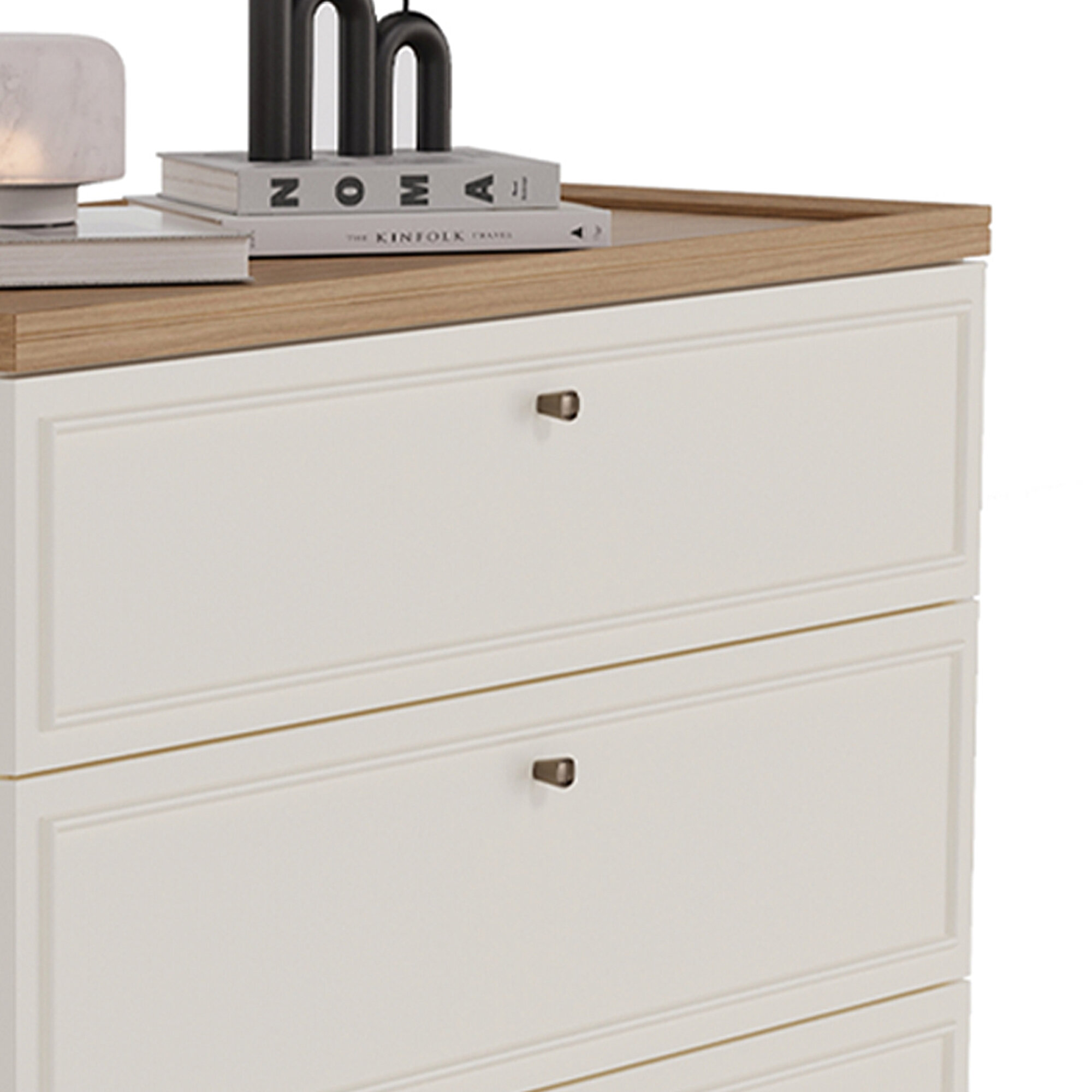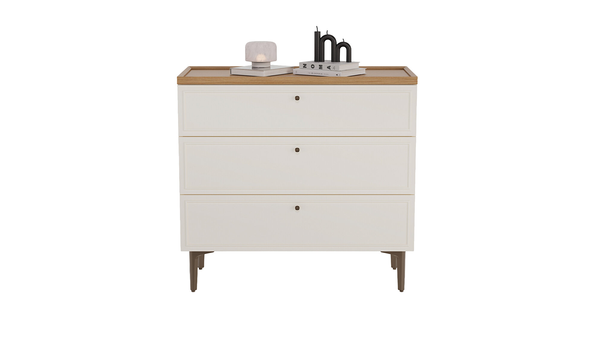 Country-style designNatural and modern wood aestheticsWood and profile detailingWarm and functional designComfortable eleganceStriking texturesOak and cream color combinationThree-drawer configurationMink-colored metal handle designSoft-close drawer rail system