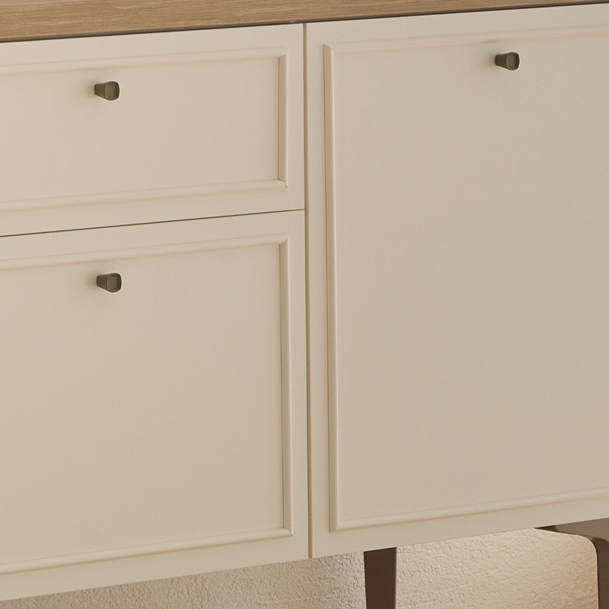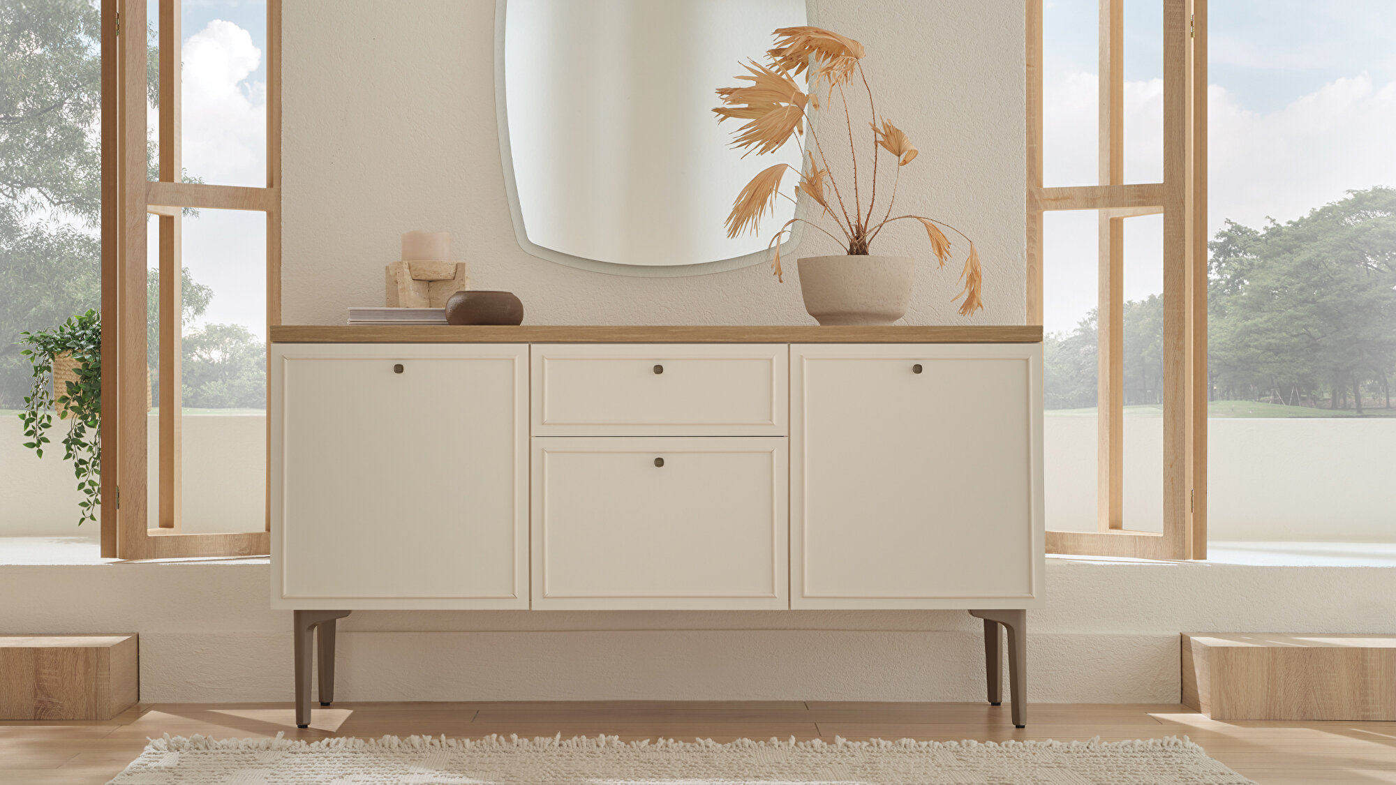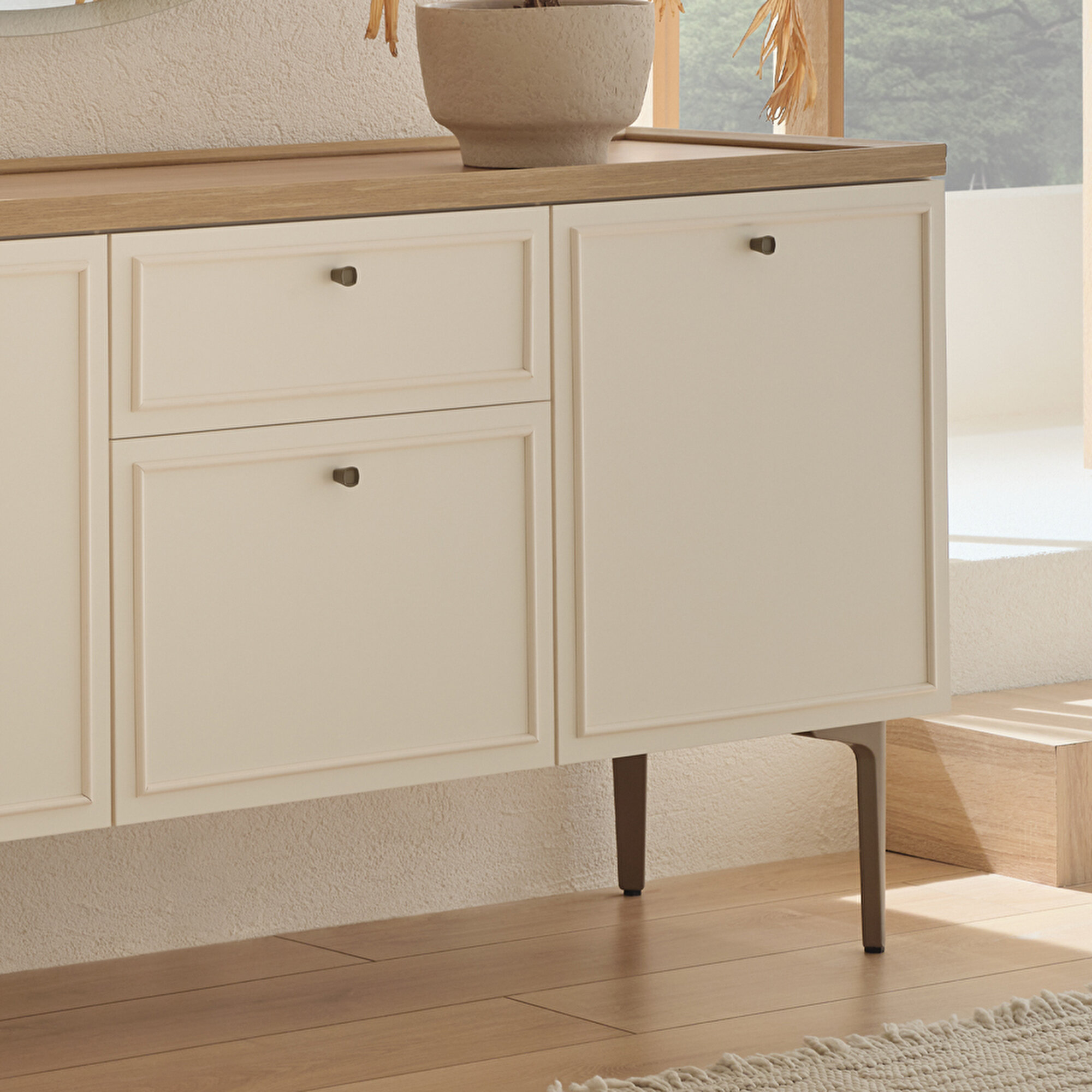 Country-style designNatural and modern wood aestheticsWood and profile detailingWarm and functional designComfortable eleganceStriking texturesOak and cream color combinationSideboard alternative in two different sizesOne-drawer configurationMink-colored metal handle designSoft-close hinge and drawer rail system