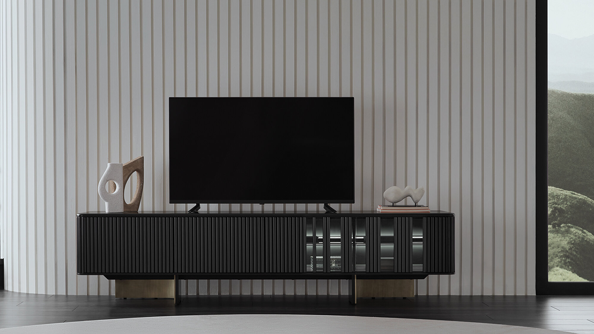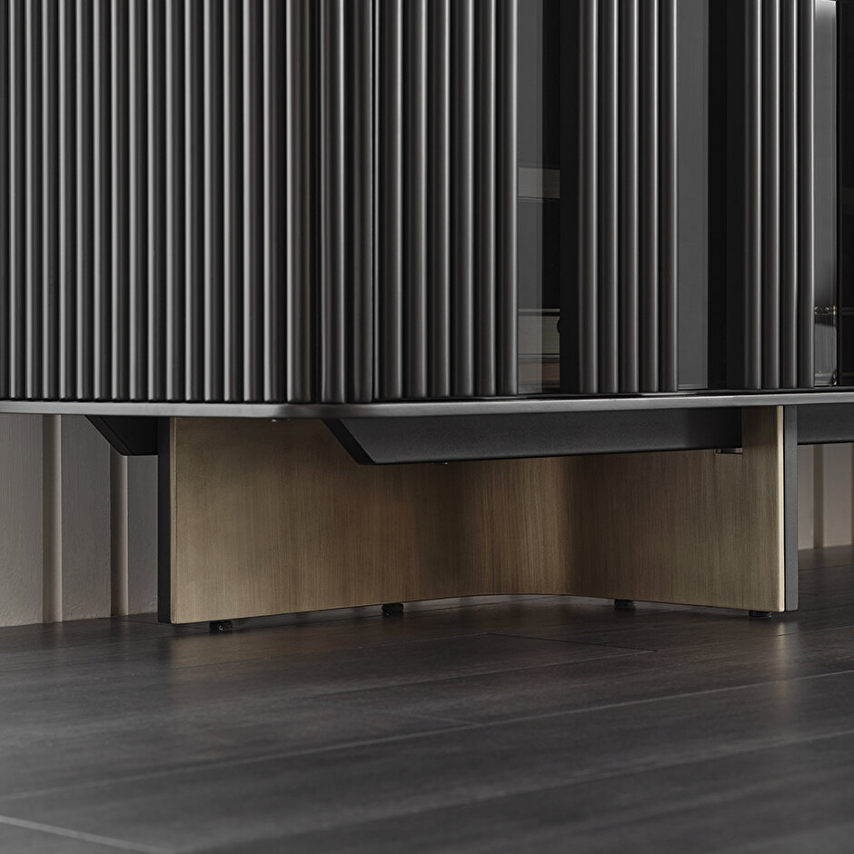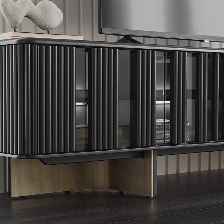 Эклектичный визуальный стиль ТВ-стеллаж Osaka привлекает внимание своим современным стилем и выразительной эстетикой. Металлические ножки в черно-золотом исполнении придают модели элегантный и утонченный вид.