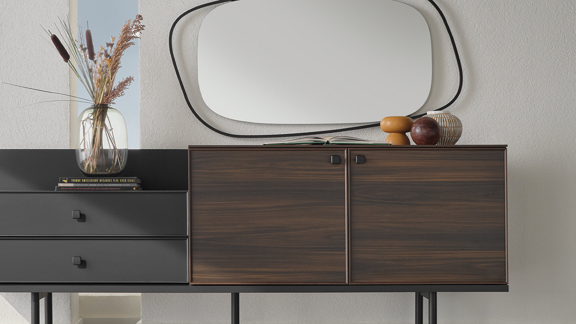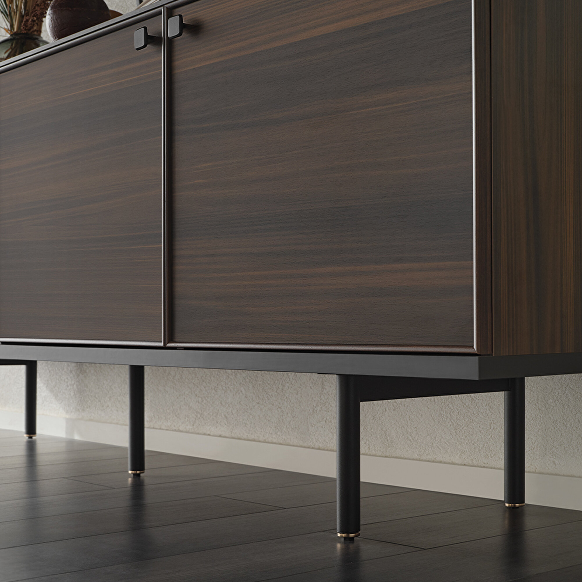 Вневременная эстетика Рамка на дверцах и ящиках придаёт серванту Parma элегантный акцент. Сочетание тёмного орехового и матового чёрного цветов выделяется естественной гармонией.
