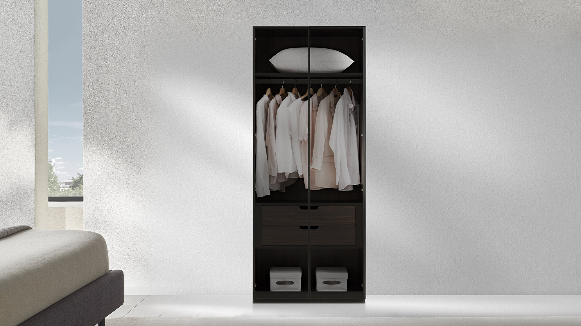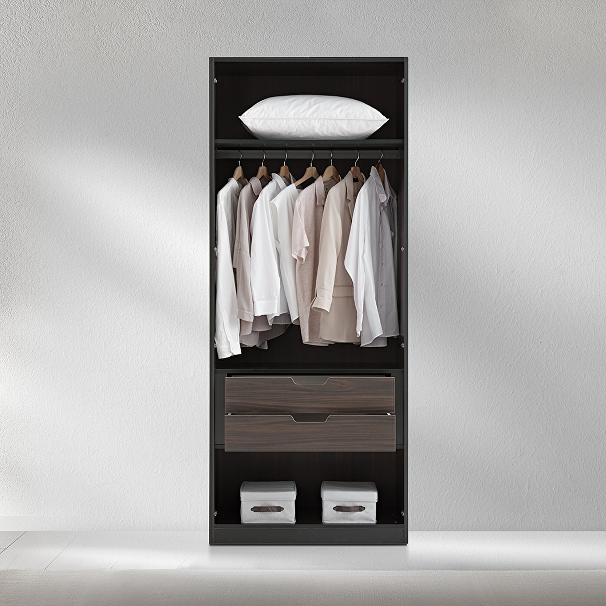 Практичный дизайн Шкаф Parma сочетает элегантность и продуманный дизайн, предлагая удобное пространство для хранения благодаря двум ящикам.
