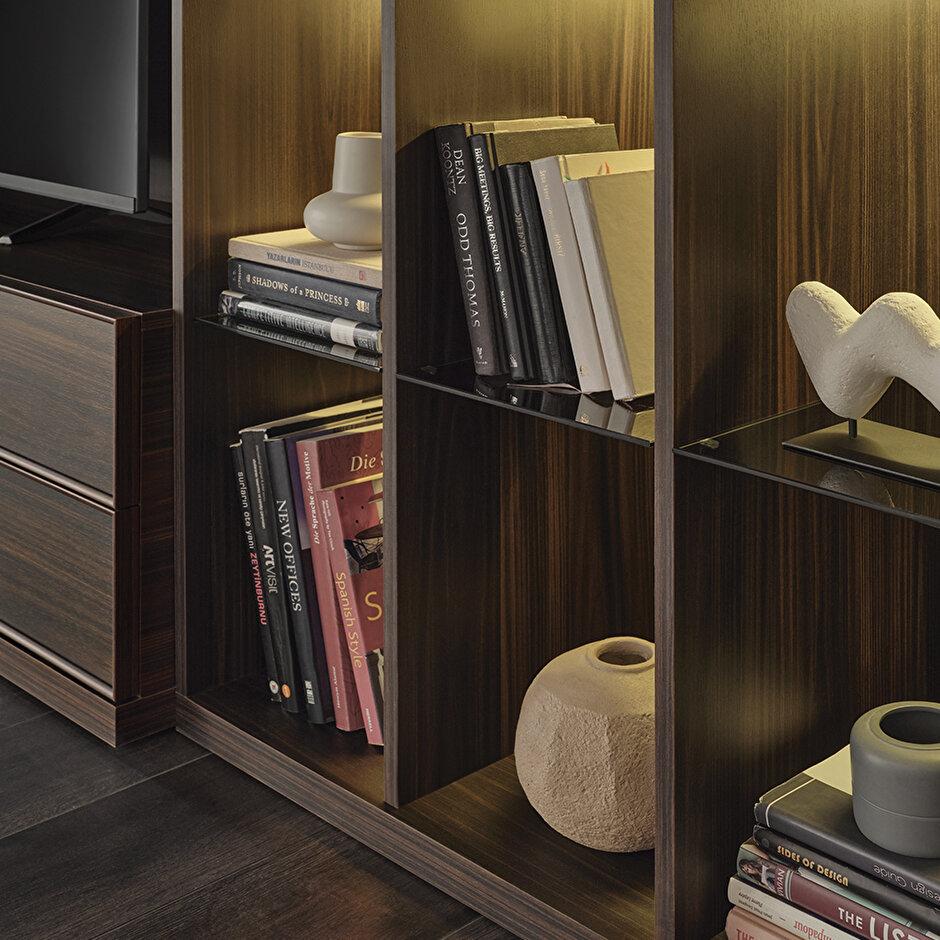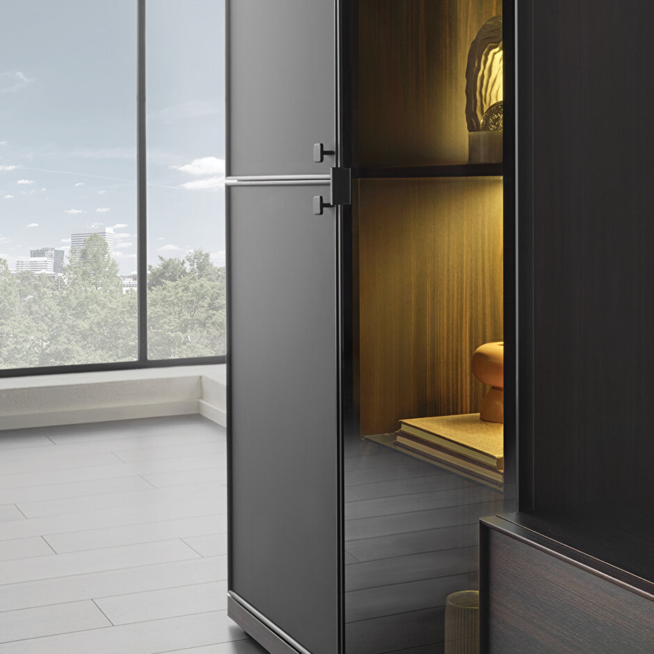 Привлекательные детали ТВ-стеллаж Parma с четырьмя различными настенными модулями приобретает гармоничный облик благодаря чёрным металлическим ручкам, подчёркивающим стиль серии. Чёрные металлические ножки модели Parma с бронзовыми наконечниками придают дизайну коллекции ещё более выразительный и изысканный вид.