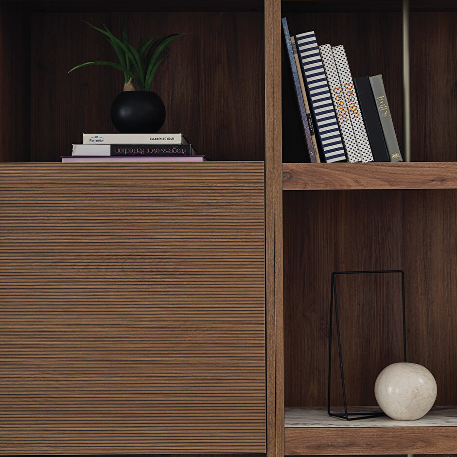 Визуальность, выделяющаяся среди других Книжный шкаф Pavia, с природной эстетикой и современным древесным покрытием, выделяется мраморным рисунком и глубокими линейными декоративными элементами, создавая уникальный визуальный эффект.