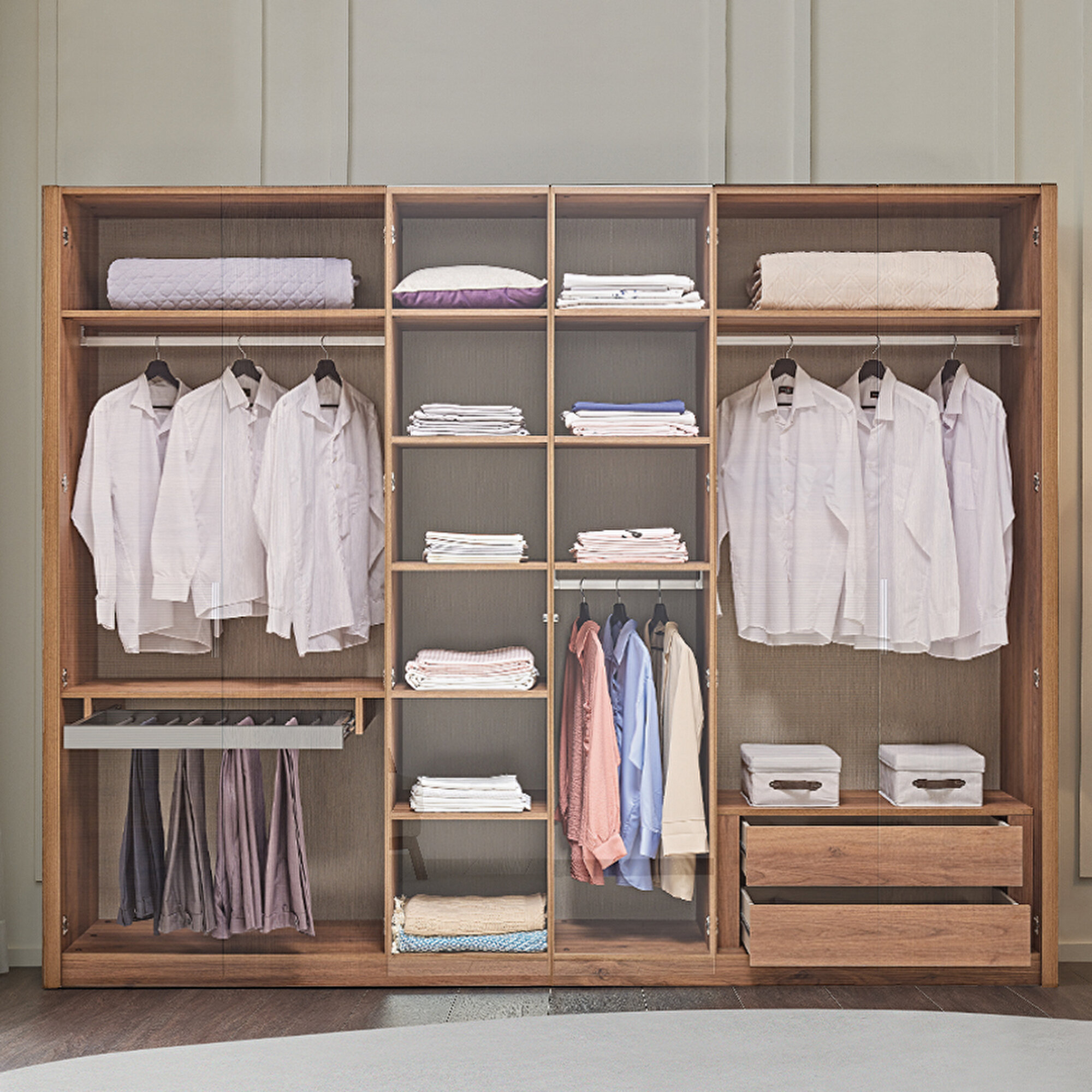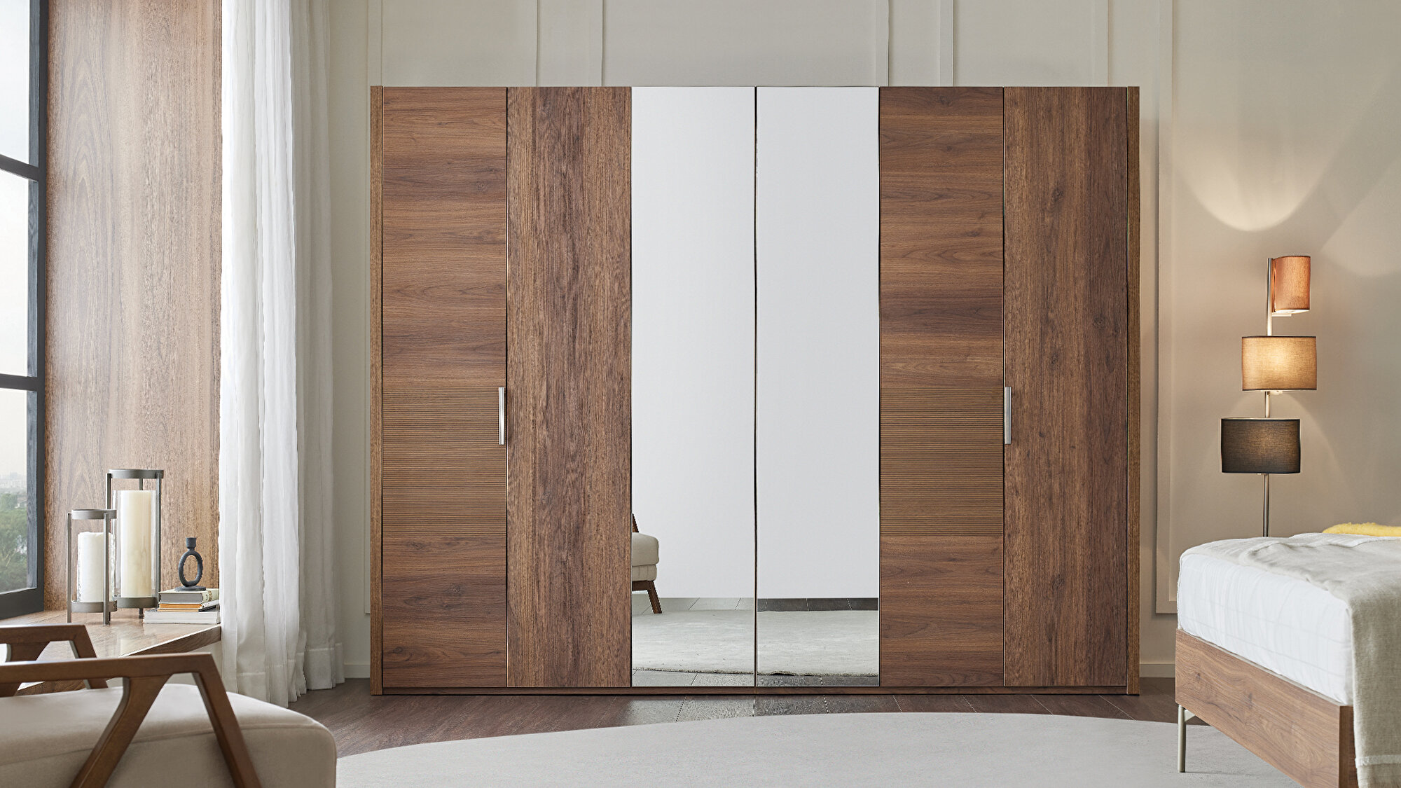 Шестидверный шкаф Pavia, благодаря своим геометричным линиям, привносит в спальню современный и элегантный акцент, гармонично сочетая природную эстетику дерева с функциональностью. Глубокие декоративные элементы и металлические ручки цвета Brushed Inox добавляют выразительности, а встроенная брючница делает дизайн не только стильным, но и удобным для повседневного использования.