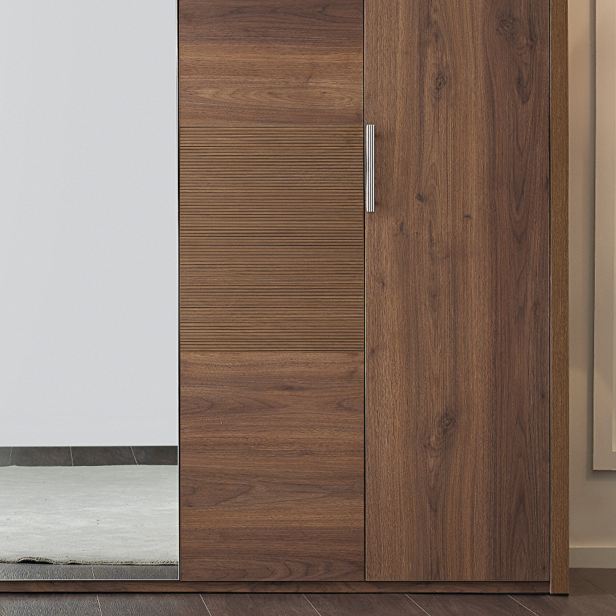 Дизайн с брючницей Шкаф Pavia с текстурой дерева и оттенком тёплого ореха, дополненный линейным декором на поверхности, придаёт ему стильный и элегантный вид. Брючница добавляет практичные преимущества, обеспечивая удобство в использовании.