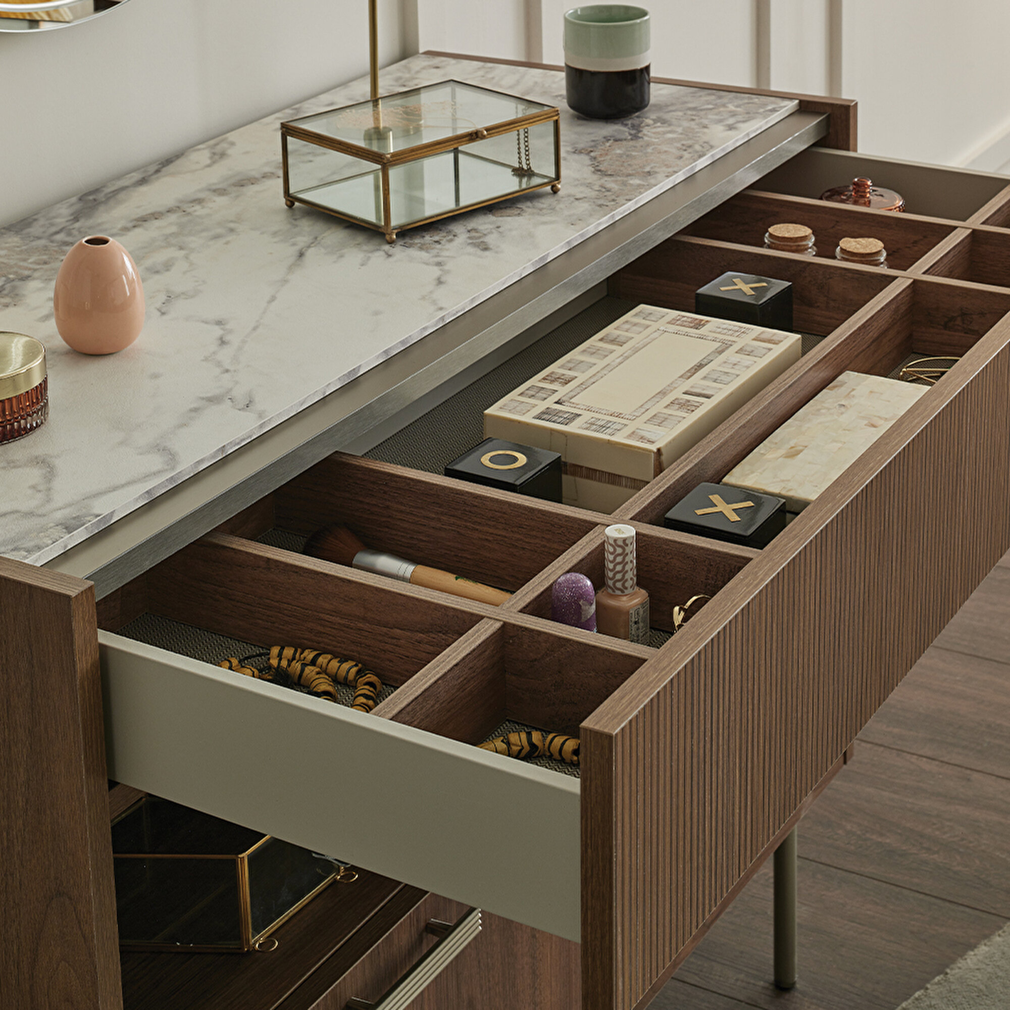 Комод Pavia, элегантно отражающий современные и натуральные дизайнерские линии коллекции Pavia, сочетает стильные детали с функциональностью. Линейный декоративный узор на поверхности и металлические ручки и ножки создают выразительные акценты, в то время как система разделения в ящиках помогает создать организованное и стильное пространство.