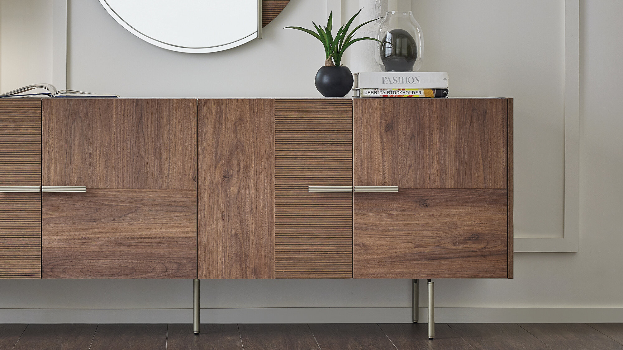 Сервант Pavia, отражая натуральную эстетику дерева с тёплым ореховым цветом и мраморным рисунком на поверхности, привносит в интерьер неподвластный времени стиль. Один выдвижной ящик с системой плавного закрывания обеспечивает удобство и функциональность. Линейный декоративный узор на поверхности и металлические ручки и ножки создают визуально богатые и выразительные детали.