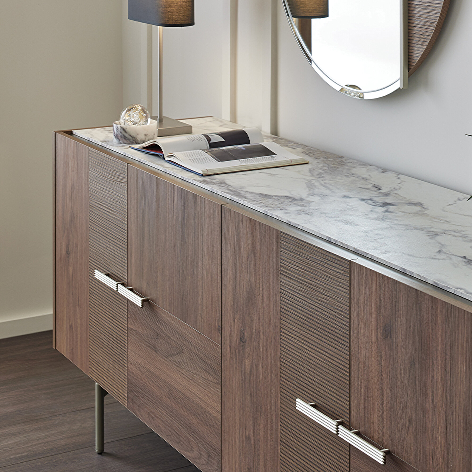 Вневременная элегантность мрамор Сервант Pavia, выделяясь геометрическим дизайном, отражает естественную эстетику дерева, а использование мраморного рисунка на модулях придаёт декору неподвластный времени и утончённый стиль.