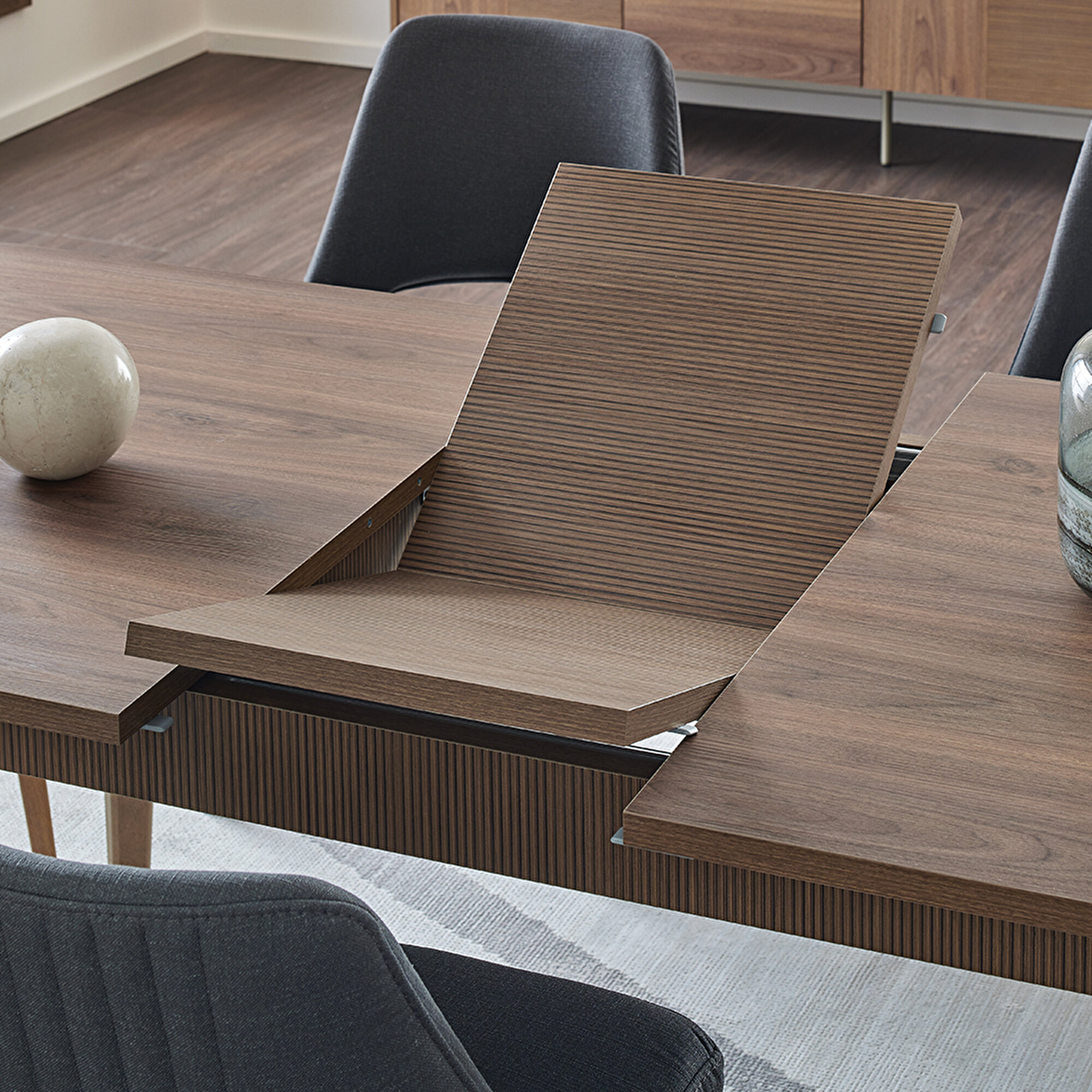 Естественный и тёплый эффект Раздвижной стол Pavia, объединяя функциональный дизайн с элегантным внешним видом, придаёт декору современный и натуральный акцент благодаря использованию тёплого орехового дерева.
