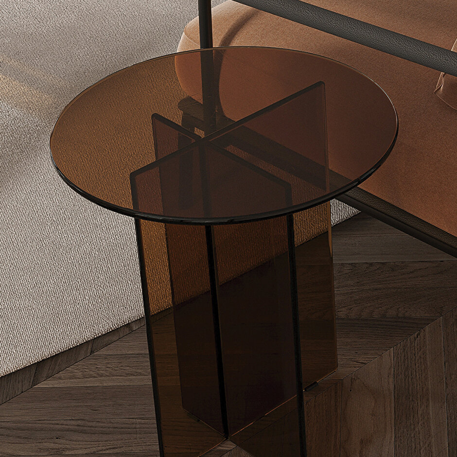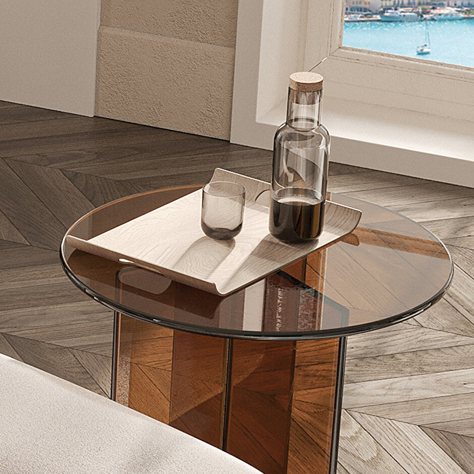 Журныльный столик Rika с округлой формой и прозрачной конструкцией предлагает новый уровень стиля для вашего пространства. Изготовленный из плексигласа с бронзовой отделкой, он доступен в двух размерах и идеально вписывается в современный интерьер.