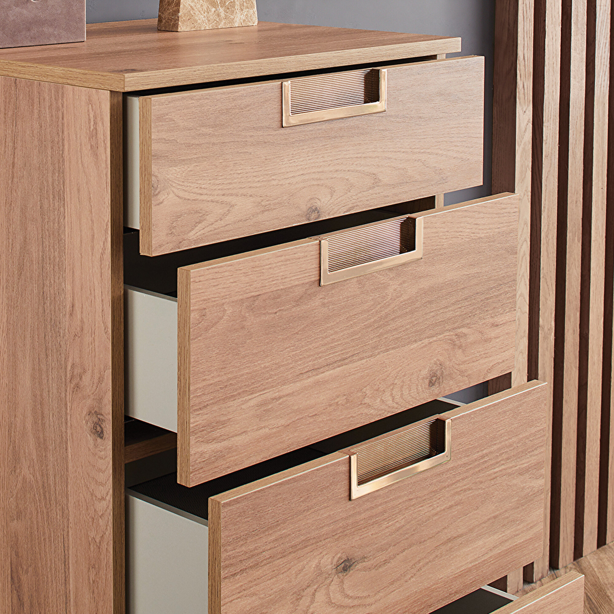 Идеальное решение для хранения Комод Sona становится стильным и функциональным дополнением интерьера спальни. Пять вместительных ящика обеспечивают удобное хранение, помогая поддерживать порядок и создавая уютную атмосферу.