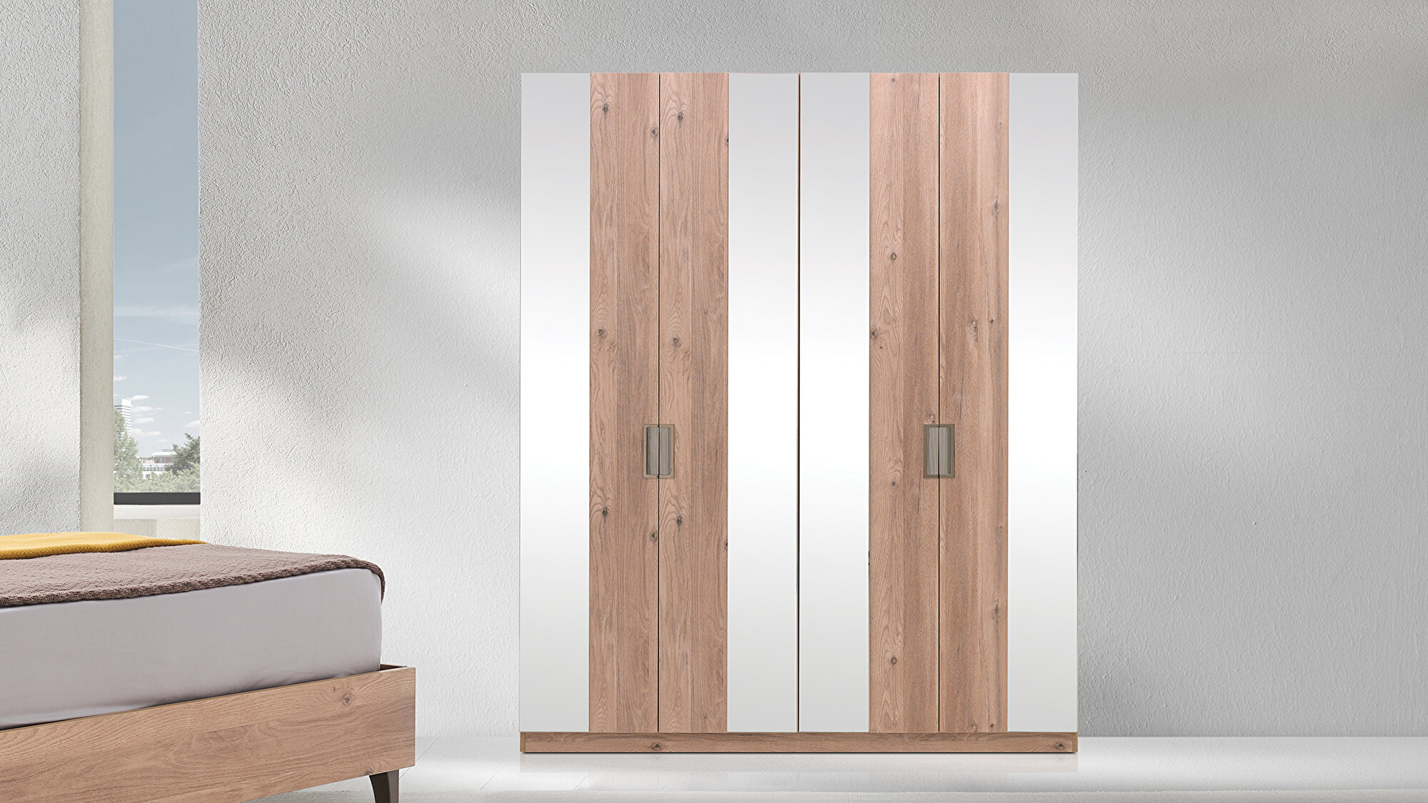 Четырехдверный шкаф Sona привлекает внимание благодаря гармоничному сочетанию светлого орехового дерева и металлического коричневого оттенка, создавая в спальне теплую и уютную атмосферу. Бронзовые ручки и зеркала натурального цвета подчеркивают естественное и гостеприимное воздействие дерева, придавая шкафу Sona неповторимую атмосферу уюта и элегантности.