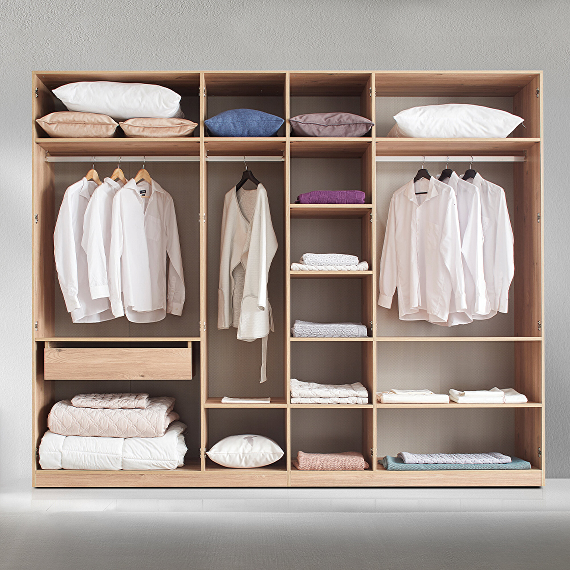 Функциональные и просторные зоны хранения Шкаф Sona обеспечивает удобное хранение личных вещей благодаря вместительным отделениям и функциональным полкам, помогая эффективно организовать пространство.
