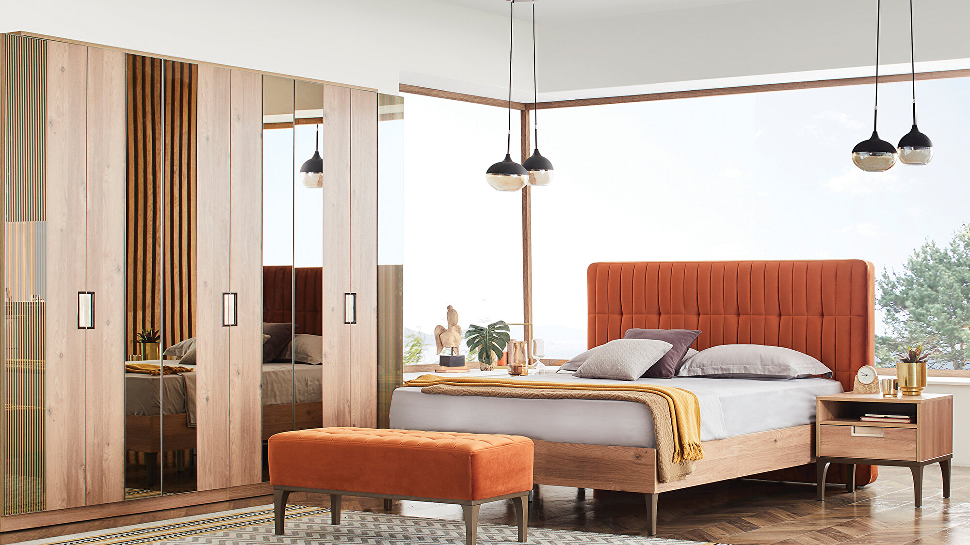 Шестидверный шкаф Sona привлекает внимание благодаря гармоничному сочетанию светлого орехового дерева и металлического коричневого оттенка, создавая в спальне теплую и уютную атмосферу. Бронзовые ручки и зеркала натурального цвета подчеркивают естественное и гостеприимное воздействие дерева, придавая шкафу Sona неповторимую атмосферу уюта и элегантности.