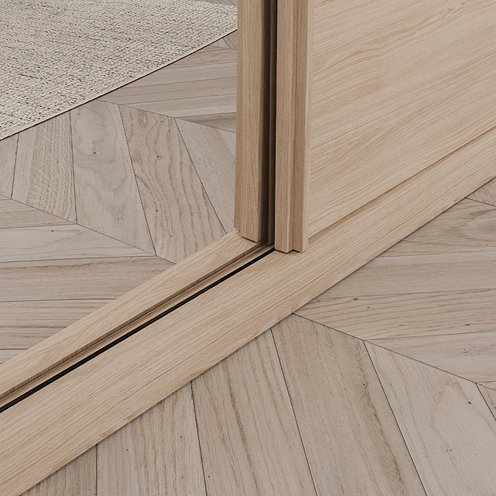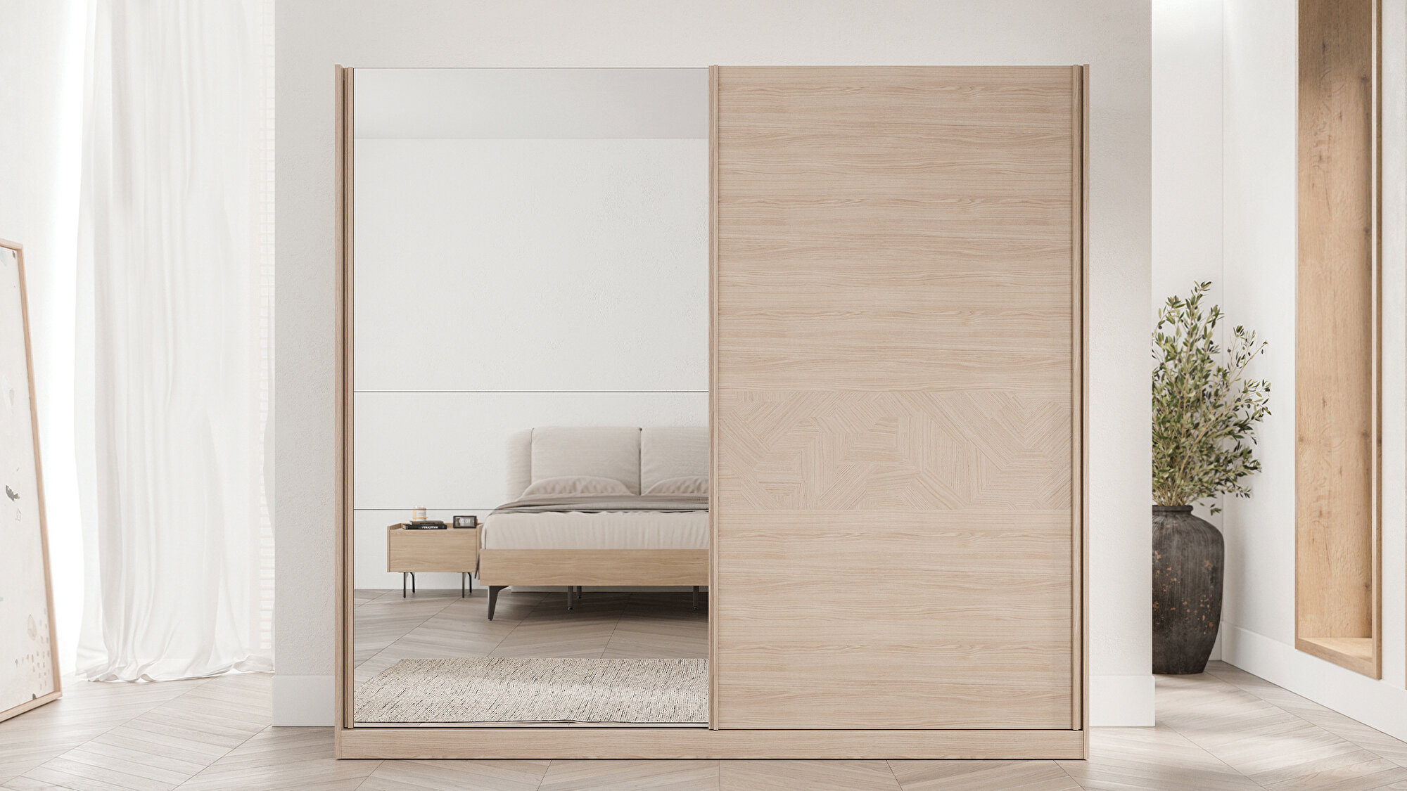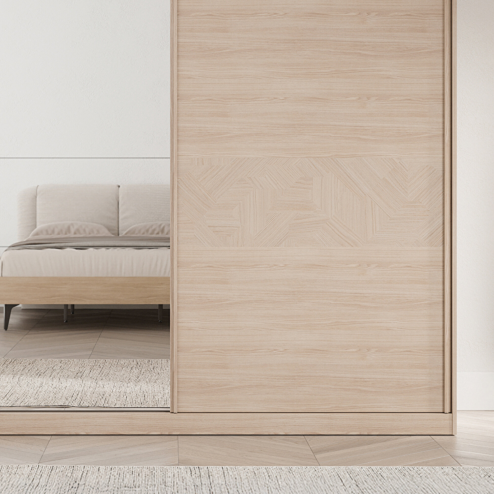 Шкаф с раздвижными дверями Terra выделяется своим современным дизайном и тщательно проработанными деталями. Будучи частью одноимённой коллекции, он оснащён фирменными металлическими ручками, гармонично дополняющими общий стиль. Декоративный геометрический узор на фасаде придаёт шкафу элегантный и выразительный облик. Светлый дуб в сочетании с натуральным зеркальным покрытием на дверцах создаёт ощущение лёгкости и естественности. Два выдвижных ящика обеспечивают дополнительное пространство для хранения, делая шкаф ещё более функциональным.