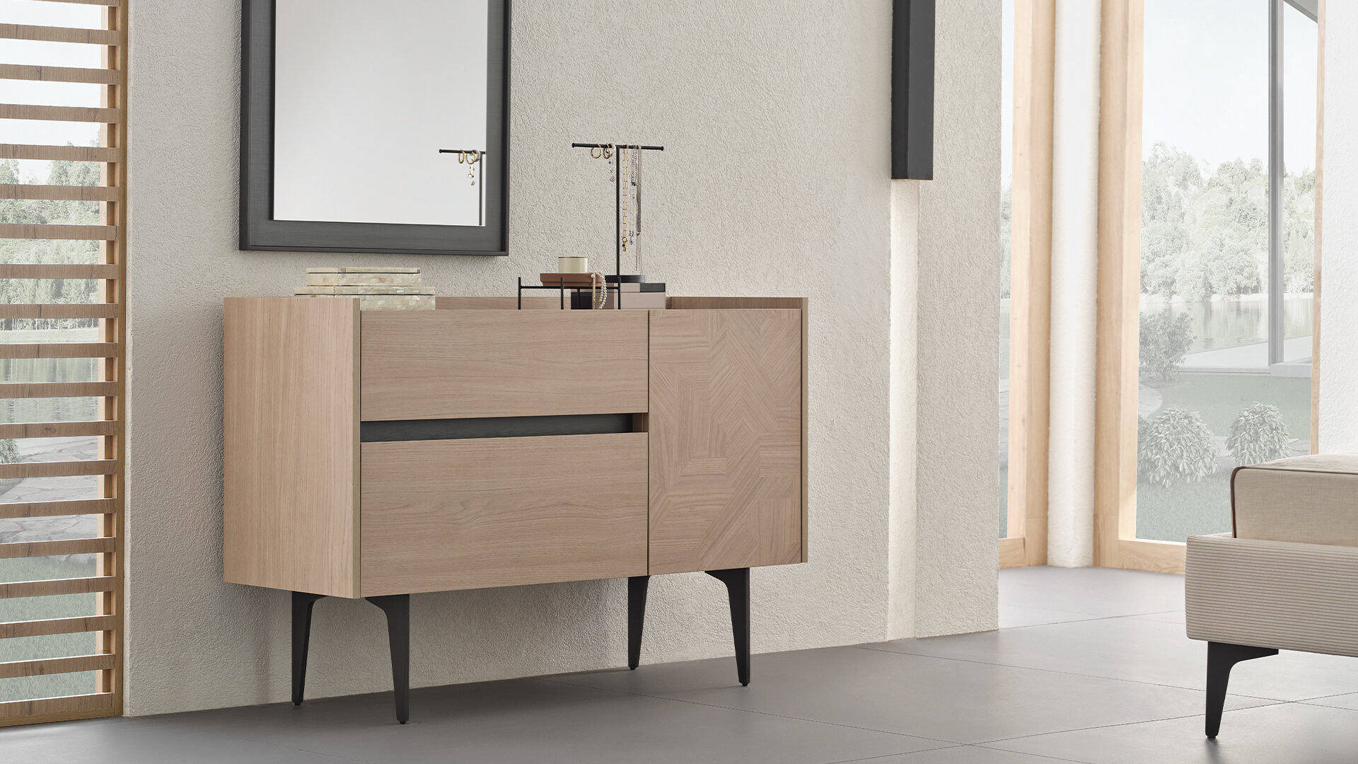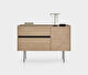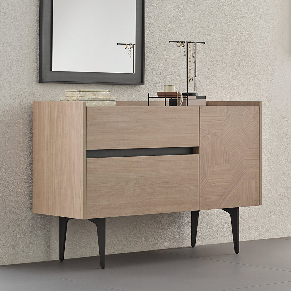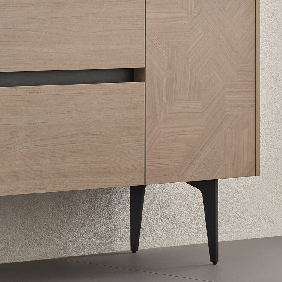 Комод Terra с лаконичным и естественным дизайном становится идеальным выбором для современных интерьеров. Детали высокой точности исполнения подчёркивают его элегантность, а современный стиль привлекает внимание. Сочетание оттенков светлого дуба и антрацита создаёт природную гармонию, которая дополняется текстурированной поверхностью с текстильным эффектом, придавая модели ещё более стильный вид. Фасад дверцы украшен декоративным геометрическим узором, усиливающим визуальную выразительность. Два выдвижных ящика обеспечивают дополнительное пространство для хранения, делая комод не только эстетичным, но и функциональным решением.