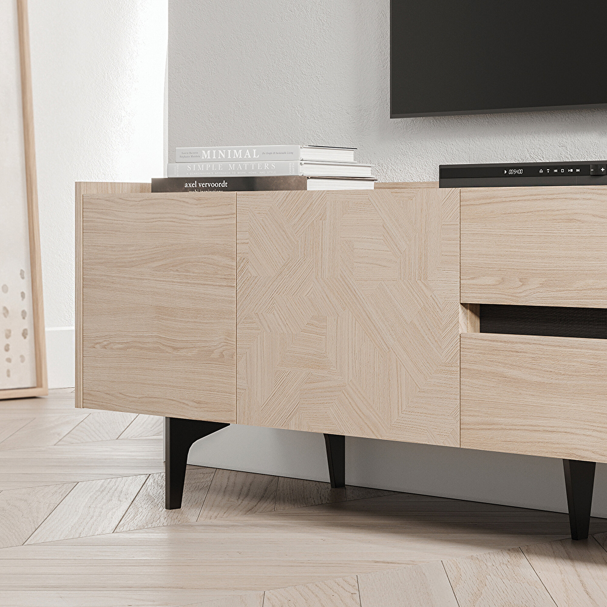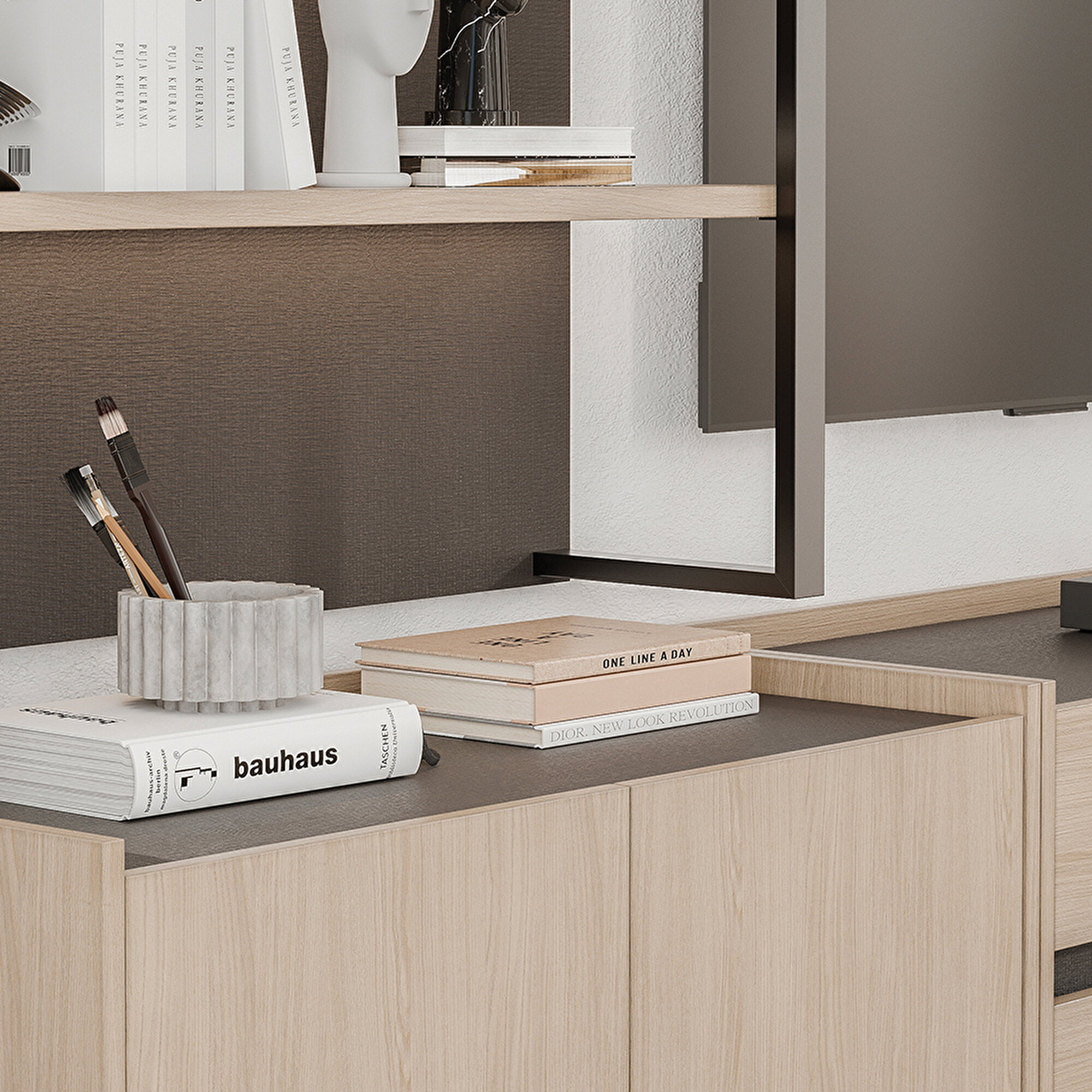 ТВ-стеллаж Terra выделяется высококачественной обработкой деталей и продуманным дизайном. Сочетание оттенков светлого дуба и антрацита придаёт конструкции естественный и стильный вид. Современный и лаконичный дизайн делает ТВ-стеллаж Terra универсальным решением для различных интерьерных концепций. Дополнительную изысканность ему придаёт встроенный книжный модуль, который можно использовать в декоративных целях. В дверцах стеллажа предусмотрена LED-подсветка, повышающая удобство использования. Модульная система из семи элементов позволяет создавать различные комбинации, делая этот стеллаж идеальным выбором для стильных гостиных.