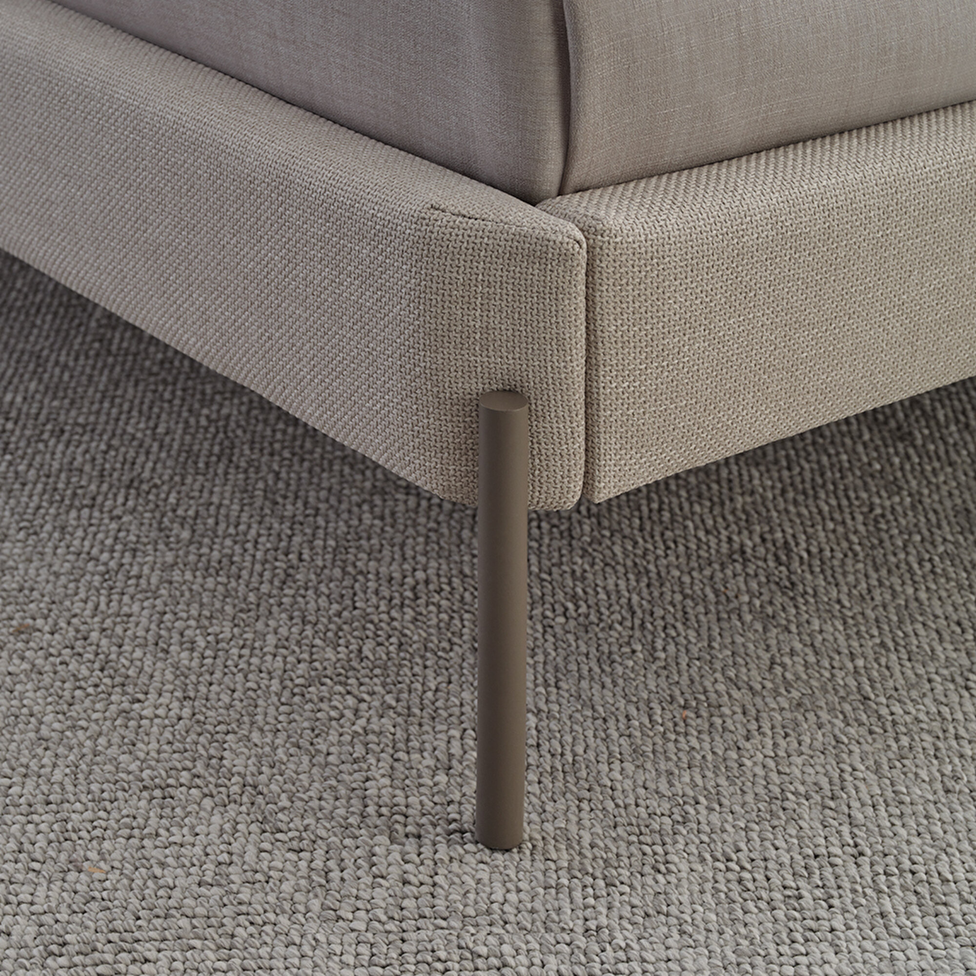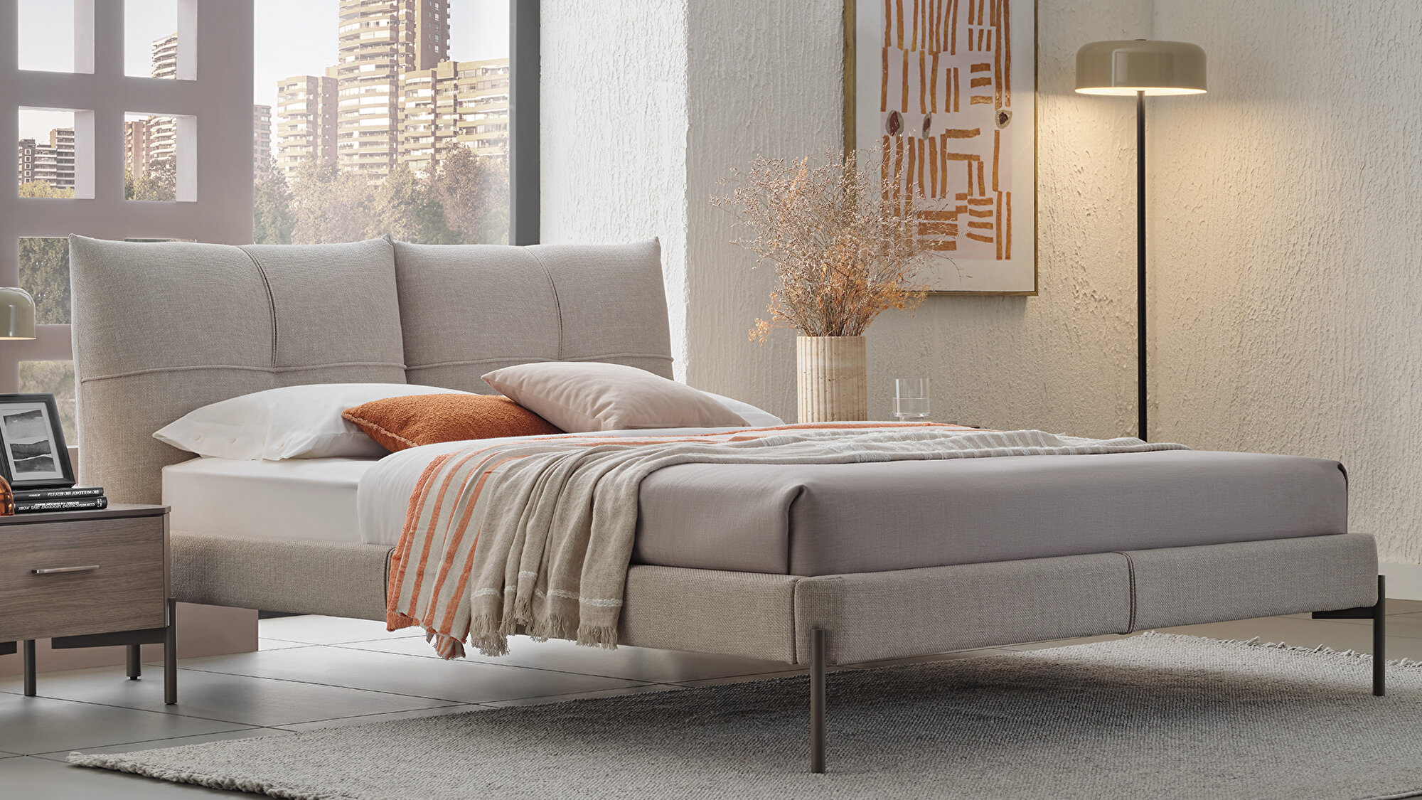 Основание кровати Varena, с удобным изголовьем, напоминающим две подушки, создаёт идеальное место для отдыха благодаря мягким линиям и металлическим ножкам.